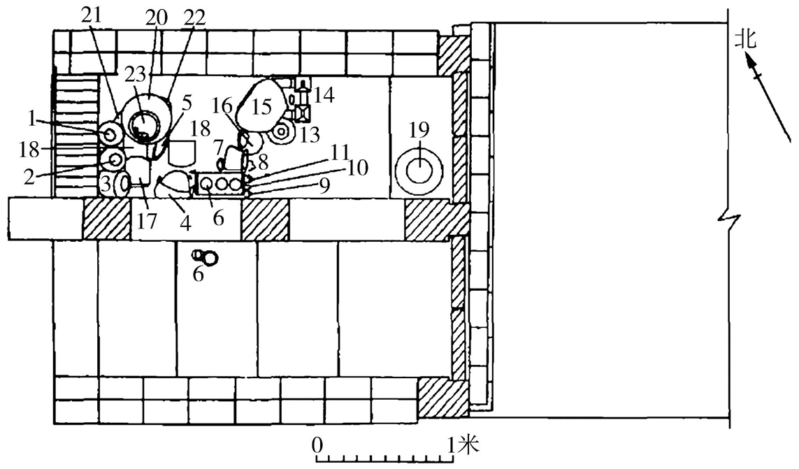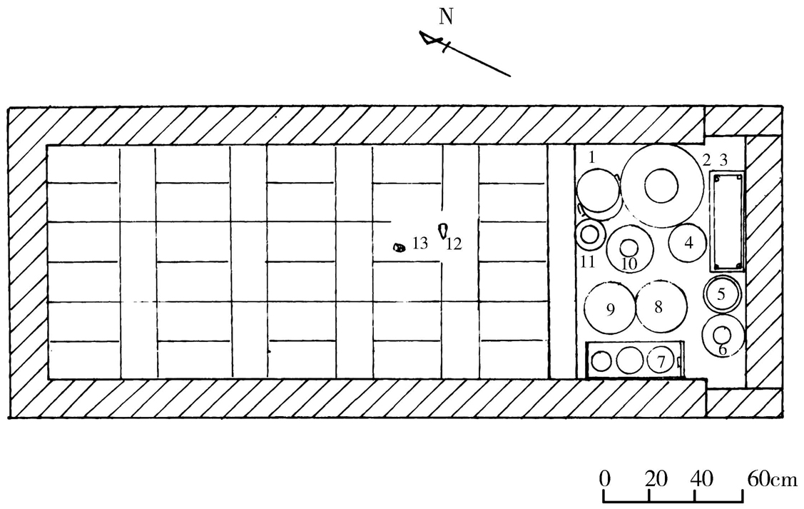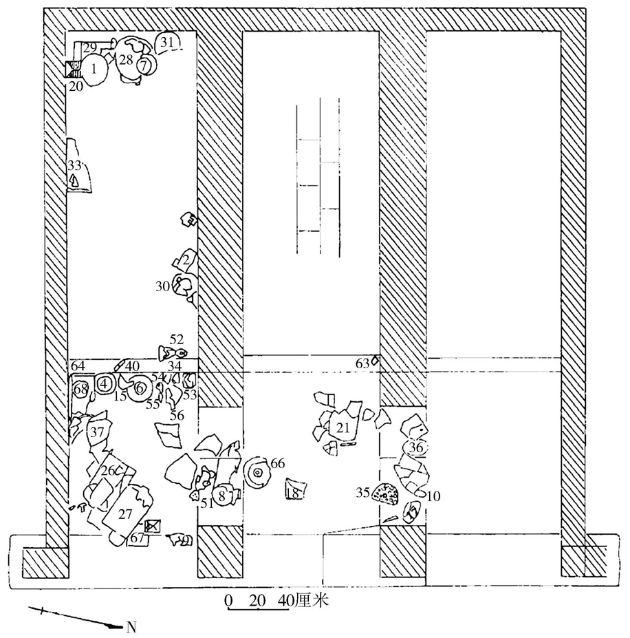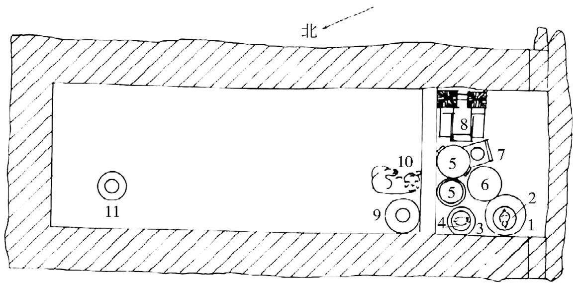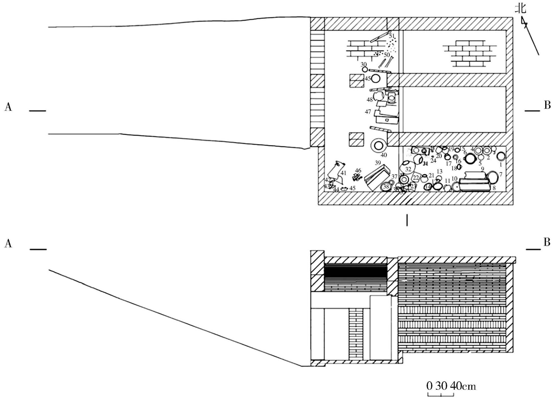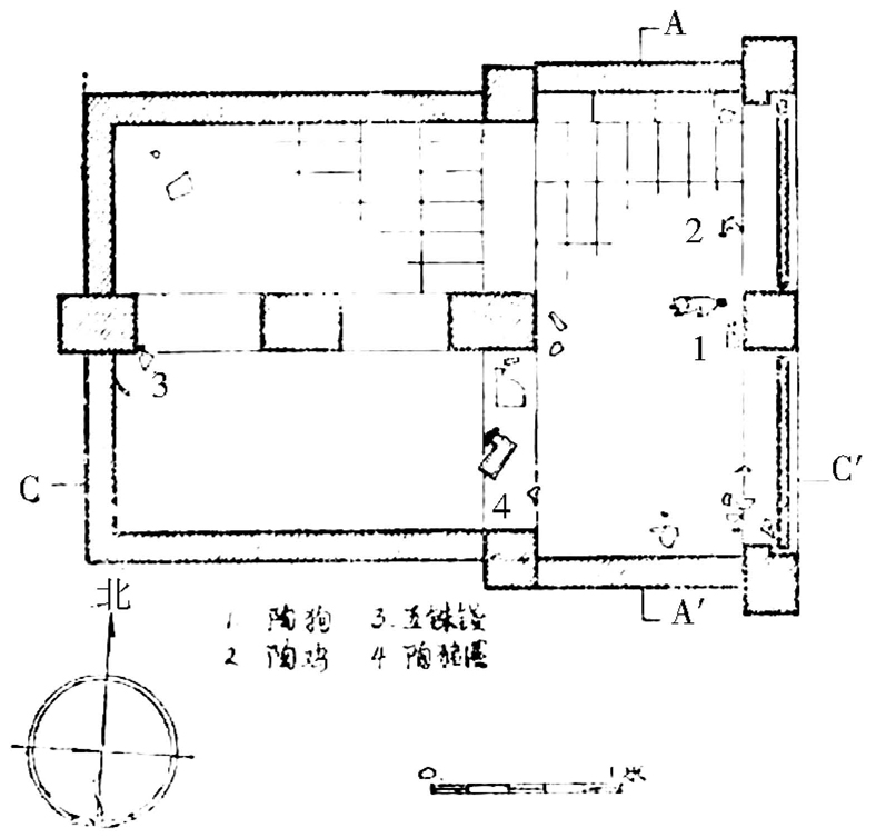 1、22、23.奁;2、4、9.仓;3、5、46.仓盖;6.鼎;7、38.盆;8、39.方盒;10、12、14.博山炉盖;11、13、19—21、36.罐;15—18、35、37、49.钵;24、25.汲水小罐;26、52.小盆(灶上);27.甑(灶上);28.釜(灶上);29.灶;30.铜镜;31、34.盒;32.瓮;33.磨;40.壶;41.狗;42、44.鸭;43.鸡;45.猪;47.圈厕;48.井;50.铜钱;51.绿松石玉珠