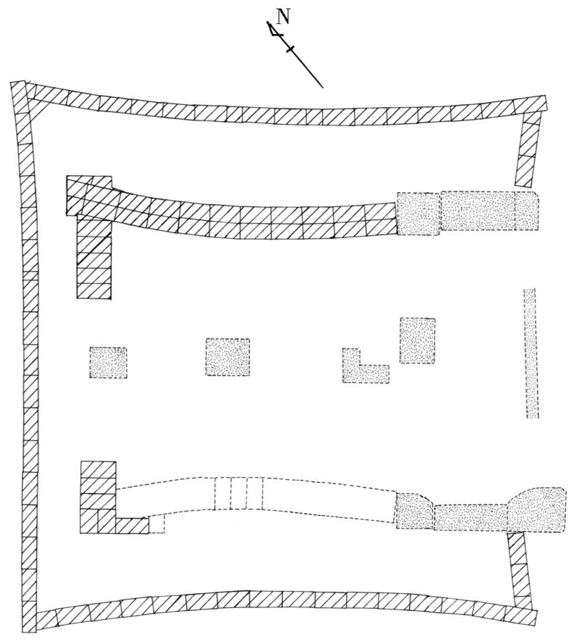 (9)唐河县湖阳罐山汉代画像石M6墓葬形制(图4-12)。位于M5西,两墓并列。M6大门偏后于M5大门约1米。墓室平面呈长方形,由墓道、墓门、两个并列的墓室组成。墓门向北,方向20°。墓室南北长414厘米、东西宽272厘米。墓门前为窑场的取土坑,墓道已不存。墓门封门砖上部已被揭走,下半部分为小砖与楔形砖混合错缝平砌,残高92—120厘米,宽仅存94厘米,厚16厘米。墓门门楣已不知去向,仅存2个门柱、1个东扉、半个西扉、2块门槛石。墓门残高122厘米、宽164厘米。墓门南侧即东墓室。东室内长368厘米、宽112厘米。券顶已不存,墓壁仅存下部,砌法为错缝平砌。东、西两壁向下沉降,尤其西墙沉降较甚,这当于墓底地基有关。铺地砖基本被揭完,仅存后部一小部分,为丁砖铺地。从形制分析,该室应分前后室,前室南边应至西室门道南柱,铺地砖可能为平铺。如是,东室长约247厘米。前室西壁有石质门道通向西室,门楣已不存,仅剩两个门柱、一块断裂的门槛石。西室内长358厘米、宽95厘米。券顶不存,墓壁残甚,西南部已到生土,铺地砖皆不存。由于M6盗扰严重,仅见到零碎的陶器残片,从这些陶器残片中可看出的器形有鼎等。另有零星的鎏金小铜饰件。墓砖皆青灰色,一面饰绳纹,分小砖和券砖两种,小砖长33.3厘米、宽16厘米、厚5.7厘米。券砖为楔形,32.8厘米、宽16厘米、外侧厚4.5厘米、内侧厚3厘米 [29] 。