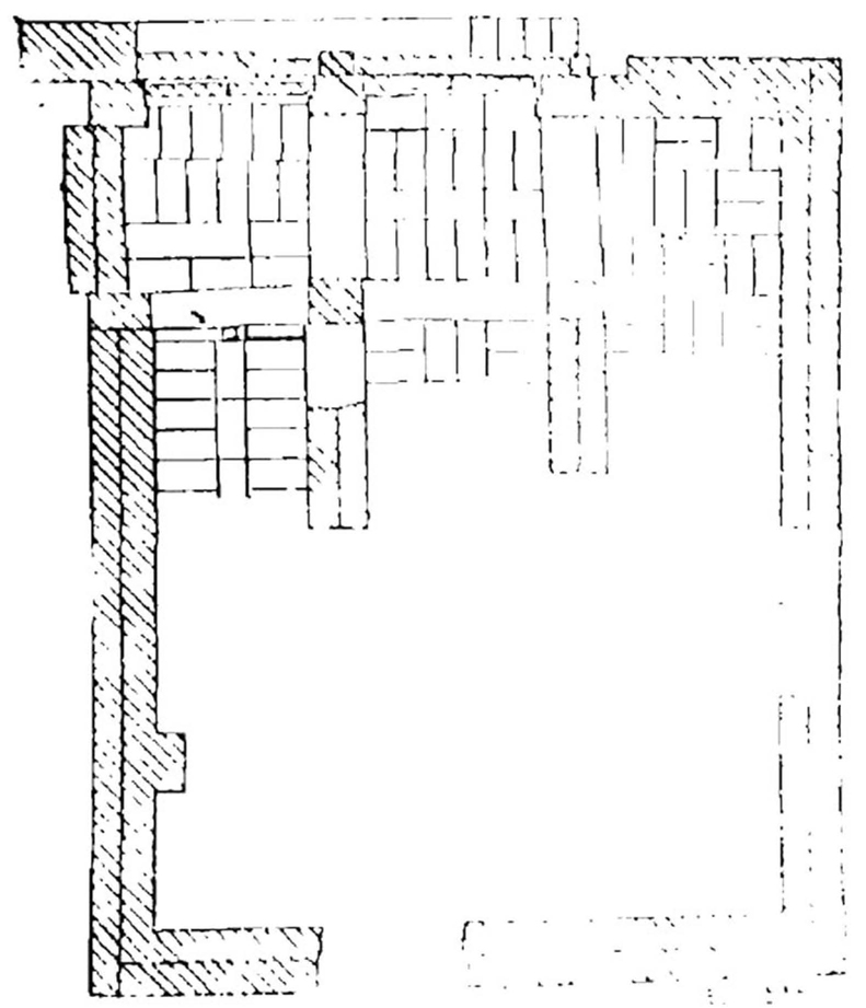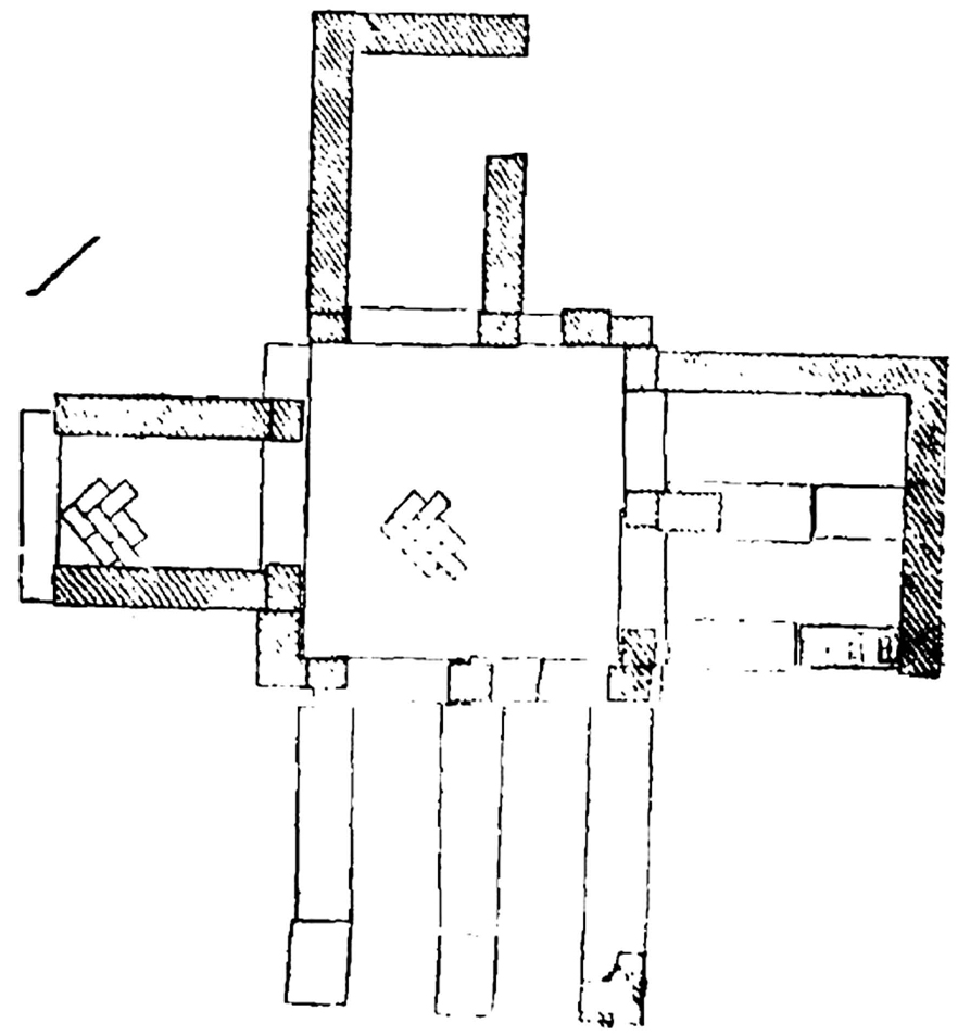 (23)南阳市赵寨汉代画像石墓墓葬形制(图4-26)。该墓上部原是居民住宅区,这次修路墓室上部又毁坏一部分,现仅存下半部分,但墓葬形制还算清晰,为砖石混合结构墓,由前室和三后室组成。该墓坐北向南,方向200°。墓室长498厘米、最宽处444厘米、残高56厘米,残存的墓圹开口距地表约150厘米。室内填有五花土、碎砖块、陶片、石渣等。因该墓毁坏严重,是否有墓道,不清楚。墓室所用砖均为长方形小条砖,长32厘米、宽16厘米、厚5厘米。该墓因扰乱严重,仅在墓室内清理出灰陶残片(器形有圈厕、方盒、博山炉盖、壶等)。墓门:从前室门口的3块门槛垫石看,推测应有墓门。前室:呈长方形,东西横长444厘米,南北宽130厘米,残高56厘米。东、西两壁宽32厘米,为一丁二顺垒砌。铺地砖南部为竖排对缝平铺,在近中后室处铺地砖改为三排横砖对缝平铺。在前室填土中有倒放的柱石1块、石料1块(推测这两块石料应为墓门上的门柱石和门楣石)。后室:呈长方形,长366厘米、宽410厘米,残高56厘米。从后室底部铺地的石条看,后室应有后室门和两隔墙,隔墙使其成为东、西、中三后室。从隔墙下的垫石看,垫石长236厘米。在后室北部铺地砖,为三排横砖对缝平铺。西室铺地砖为竖排对缝平铺;中室为横排错缝平铺;东室南部为横排错缝平铺、北部两竖排对缝平铺。后室墙宽32厘米,为一丁二顺垒砌。该墓现存的14块石料看,有槛石3块、垫石6块,其中5块石料原位置不明,均为画像石。其中画像石5块、画像5幅。 [43]