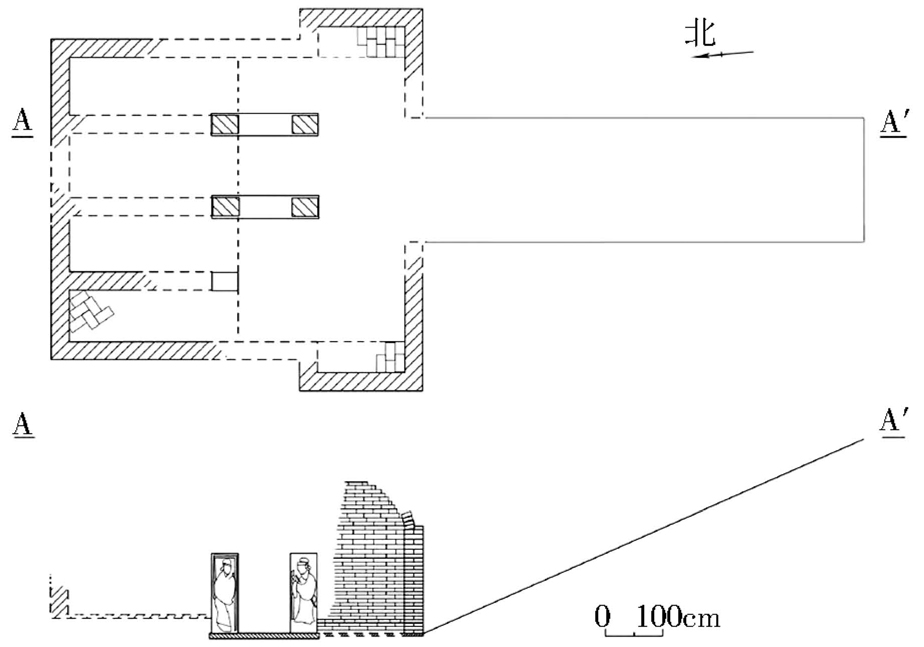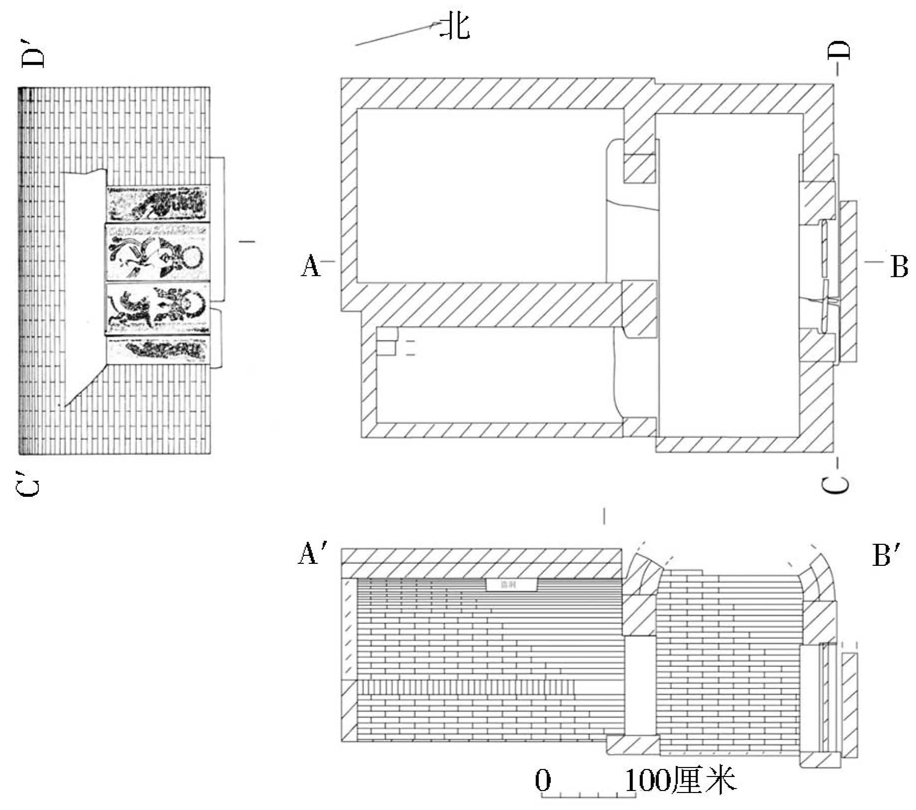痕迹。墓门:系用石材构筑成两个高1.50米、宽1.05米南北并列的墓门。两门之间有一根方柱,两侧各有一根方形门框,其上各置门楣。共用五块石料筑成两个并列的石门框,在门框石的外侧棱处,各凿有一周直角形的门扉口凹槽,并在门楣和门槛的靠边处凿有对称的门枢窝以装石门扉。墓门的每块石材构件的正背两面(除两门楣背面外)均雕刻画像。墓门的外边用小砖封堵,其中北门的封砖规整,南门的封砖作“人”字形。前室:为南北长方形,宽2.43米、进深1.22米、高2.16米。前室的后壁,有通往两个主室的石门,其结构和墓门基本相同,但没有门扉。在石门楣两侧和砖壁相接处,钉有两个对称的小铁钩。前室的两壁有左右耳室门。两门各由两根侧柱和一块门楣构成。在墓门中柱和主室中柱的顶端架有一根石梁,它不仅起到联结墓门与主室门石材构件的稳固作用,而且承托着前室顶部用小砖错缝券筑的两个并列券顶的中间相接部分,券顶的两端底部,是放置在左右耳室的门楣上,从而使整个墓室相互联结得甚为牢固。前室系用小砖铺地。主室:中间有一砖筑隔墙,把主室分为大小略同的南北两个主室,每室进深2.80米、宽1.04—1.07米、顶高1.88米。主室各壁系用小砖作一竖三卧砌筑。两个主室的券顶和前室并列券顶相连接,形成前室与主室相通连的并列券顶,地面用小砖平铺。北主室的顶部和周壁上,均涂有一层厚约1厘米的石灰面,并在高0.58米的周壁处,用土黄色颜料绘制宽8厘米的带条,顶部绘有菱形图案。耳室:左右耳室大小略同,皆为长方形,进深2.30米、宽1.04米、顶高1.66米。顶部为小砖错缝券筑,券顶的方向和前室券顶相垂直。两室的地面,也用小砖平铺。该墓出土画像石17块,画像28幅。