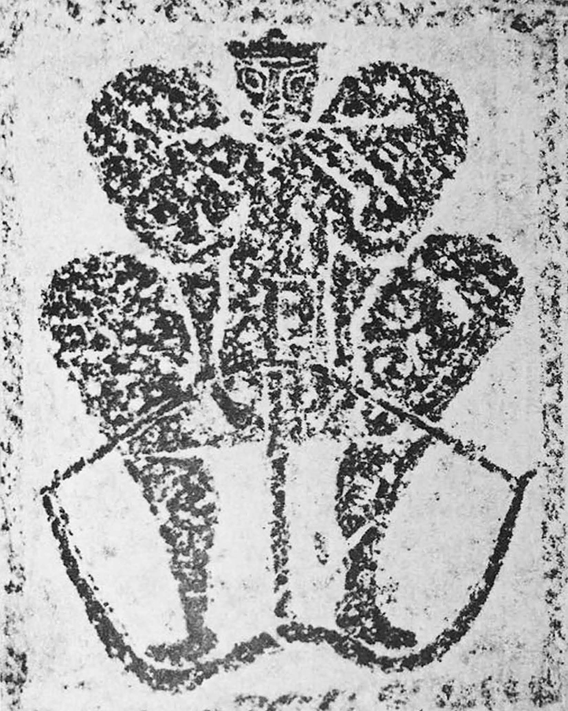 (4)桐柏县安棚汉画像石墓墓葬形制(图4-60)。这座墓早年曾遭严重破坏,封土不存,墓顶残陷。墓葬坐北向南,方向196°,砖石结构。平面布局呈“十”字形。南北长12.61米(不含墓道),东西宽13.81米,由墓道、甬道、墓门、前室、后室、左右侧室等12部分组成。墓道位于前室甬道正前方。由于墓道上面埋有现代坟墓,故未予清理。石材用于前、后室墓门部位,其他部分均用砖砌筑。现将详细情况介绍如下:甬道,包括前室、后室、左右侧室四个甬道。前室甬道位于前室门前,长2.9米,宽1.66米。砖砌墙,砌法为三平一丁,墙宽0.36米。底部用平砖铺,呈“人”字形。顶部不存,但从两侧墙体可知为拱形券顶。前端封门完整,用平砖错缝砌筑,略呈弧状。左侧室甬道,位于前室和左侧室之间,长1.82米,宽1.26米。砖砌墙,三平一丁砌法,墙宽0.36米。拱形券顶已不存。底用平砖错缝顺铺。左端留有木制门位置。右侧室甬道与左侧室甬道结构相同,只是铺底为“人”字形。后室甬道位于前室和后室之间。南北长1.3米,东西宽1.8米。墙壁、铺底和顶部与前室甬道相同。墓门有三重,第一重在前室甬道前与封门砖之间,高1.68米,宽度不详。根据各种情况分析,可能为一木制墓门。第二重位于前室与其甬道之间,即前室门,门宽1.04米,高1.4米,由门柱、门楣、门槛四部分组成,门楣和门槛石上内侧皆凿有门臼,二门柱内侧凿有门槽,说明门向内开,但没有发现门扉。第三重位于后室甬道前端,宽1.52米,高1.36米,由门柱、栌斗、门楣、门槛五部分组成。栌斗置于二门柱上方,厚0.18米,其下面有臼槽与柱体吻合。门楣已掉落于前室中部。前室:长方形,东西长3.46米,南北宽3.56米。墙壁除南北两道石门外,其余用砖砌筑,砌法为三平一丁。底面用砖平铺成“人”字形。顶部已残,从所留部分看墓顶为穹窿顶。室内堆满碎砖、扰土和器物残片。中部发现一楔形石块,当为墓室顶部用件。在东南、西南二角距墓底1.6米的壁中各砌一石羊。石羊面向前室中部。侧室:对称分布于前室左右两侧。均有甬道与前室相通。左侧室进深3.02米,宽2.98米,全部用砖砌筑。墙的砌法为三平一丁,墙厚0.36米。底面用砖平铺成“人”字形,高出前室底0.16米。顶部已残,但可看出是用四隅捻尖法砌筑而成的穹窿顶。右侧室已全部残。室内填满碎砖碴。从其残留痕迹看,结构形状等与左侧室相同。后室,东西长3.48米,南北宽3.44米,全部用砖砌筑。墙体下半部为三平一丁或四平一丁,上部为平砌错缝,墙宽0.36米。底面用砖平铺成“人”字形,高于前室底0.1米。顶部同其他各室一样。在后室底部有一用砖砌成的略呈弧状的不规则墙体,该墙与底墓室后壁连接处有一方形柱(36厘米×36厘米),其用途尚不清楚。这座墓共用画像石7块,雕刻画像及其他纹饰图案11幅。 [80]