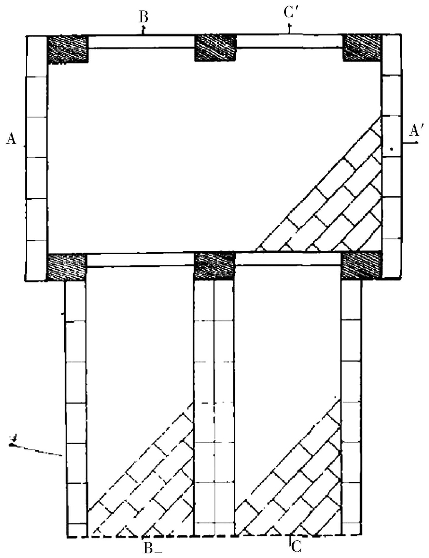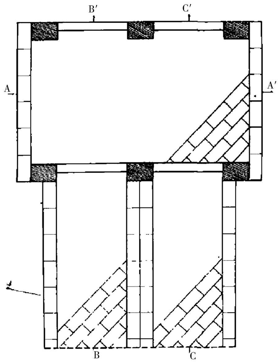 (11)南阳市刘洼村汉代画像石墓墓葬形制(图4-43)。该墓为砖石混作,地表的封土早已无存,墓顶距地表约0.4米,前室部分券顶砖已坍塌于墓底,主室的券顶砖尚好。石材主要用于墓门及主室,其余全用小灰砖砌筑。墓室二墓门、前室、二主室门和二主室组成,平面呈“T”字形。墓门向东。墓道由于压在房下无法清理,主室的后墙已毁坏。墓东西残长3.56米、前室南北宽2.80米、两主室总宽2.20米、墓门、主室门宽均为0.80米、前室底距地表深2.30米。清理过程中在填土内发现残铁犁铧一件并发现该墓已两次被盗,但画像石的位置并无移动。墓门:分南北二门,由一根中柱(柱顶端另外加一拱石),南北各有一根侧柱、二门楣、二门槛石共八块条石组成。门高1.7米、宽0.80米。没有门扉,系用长方形小灰砖四平一立错缝封堵。前室:南北室2.80米、进深1.60米、高2.30米前室地平比主室低10厘米,铺地砖为斜平铺、南北两壁皆用单平砖错缝砌筑,中间有炭梁,长1.94米,东西两端分别放置于墓门中立柱和主室的中立注上。石梁上端用两平砖砌筑后,又用楔形砖南北并列券顶,使前室主室连成一个整体。前室券顶比主室高0.4米。主室:残长1.96米、总宽2.20米、高1.85米。用两平砖砌筑的墙壁间隔成南北并列的两主室。由七块条石构成二主室门,门高1.50米、宽0.8米。南壁和北壁约系单平砖错缝砌成,然后用楔形砖券作南北并列的两个拱形券顶,铺地砖与前室相同。 [61]