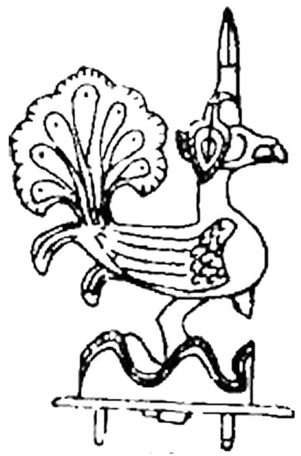 南阳地区汉画像石墓由于历史原因,众多墓葬在历史上多次被盗。在考古发掘时,几乎是盗墓贼光顾后遗留下来的一些陶器和钱币甚至一些小铜构件。更让人失望的是,有的墓葬里面空空如也,没有任何随葬品,有的墓葬遗留的全是残缺的陶片,几乎没有一件完整器。这7座墓葬中,随县王家湾墓,仅出土有陶盘、钵、屋顶、楼房等器碎片,又都不能复原,因此不作详述。随县聂家湾墓出土的有两件铜軎和8枚铜钱,8枚均为五铢,有郭的7枚,其余皆为陶器。陶器均为灰陶,有仓、双耳小罐、小炉、筒形罐、瓮、罐、灶、钵、井、耳杯以及各类家畜等。唐河县湖阳镇墓中出土器物也仅仅是陶器而已,陶器分红陶、灰陶两种。红陶施红黄釉,灰陶施绿釉,釉陶器物主要有壶、小壶、敦、方盒、仓、磨、灶、井、盆、博山炉盖,其中又以红黄釉陶居多,还有陶猪圈及猪、鸡、鸭等无釉灰陶。另外还有鎏金凤凰、鎏金龟纽铜印、玉佩等,表明了墓主人较高的身份和奢侈的生活习性。 [13] 唐河县石灰窑村墓中出土器物有陶罐、陶盆、陶仓、陶磨、陶井、陶灶以及五铢钱8枚。南阳万家园汉代画像石墓出土的器物有铜镜、铜钫壶、铜奁盒、环首铁刀等。 [14] 南阳杨官寺墓中出土有成套的鼎、敦、壶礼器。鼎又分为大、中、小三种不同的型号,且在每个鼎足的上部分别饰以老年、中年和青年三种不同年龄的人面形象。 [15] 赵寨砖瓦厂汉代画像石墓中出土的陶器为猪圈(连厕所)、灶、曾瓦、鼎、炙炉、瓮、敦盖等,另外还有仓、博山炉盖及奁盒等碎陶片。其中仅猪圈1件为豆绿釉陶,其他多为黄釉陶 [16] 。在这些墓葬中,依然有礼器出现,不过已经不再是铜器,而是以陶来代替,生活用品依然流行,并且出现了家禽家畜。在这些陶器中,绿陶和红陶以及灰陶、绿陶和红陶有带釉现象。尤其是湖阳汉代画像石墓,出现了鎏金凤凰(图4-6)、鎏金龟纽铜印、玉佩等,残留的棺椁还有漆皮的痕迹,漆皮上面还有金珀的动物造型,这向我们诉说了画像石墓在早期流行阶段部分贵族也曾使用的事实。
