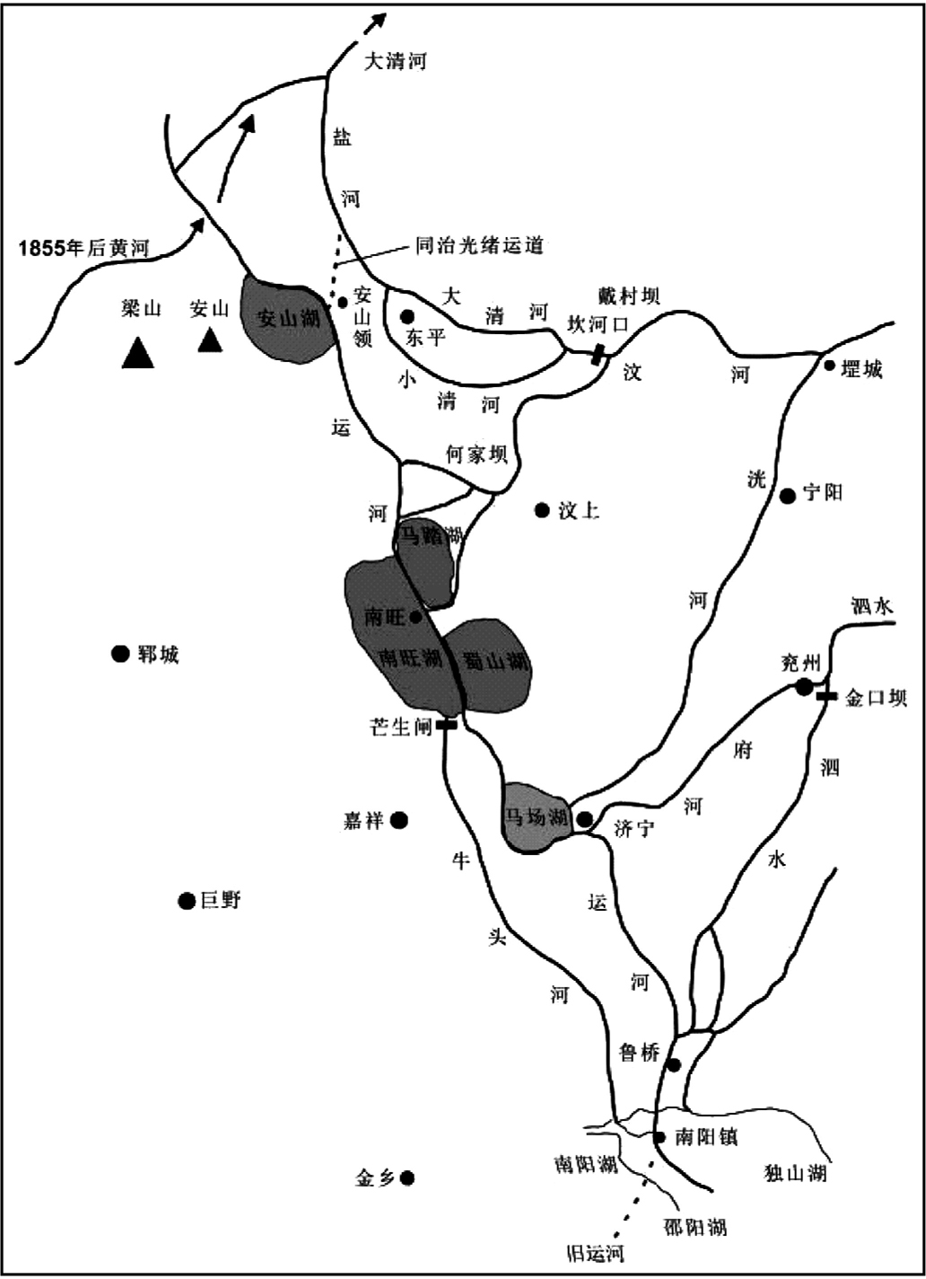 安山湖在东平州,位于运道西岸,为元末梁山泊水下移至安山以东洼地而形成的湖泊。