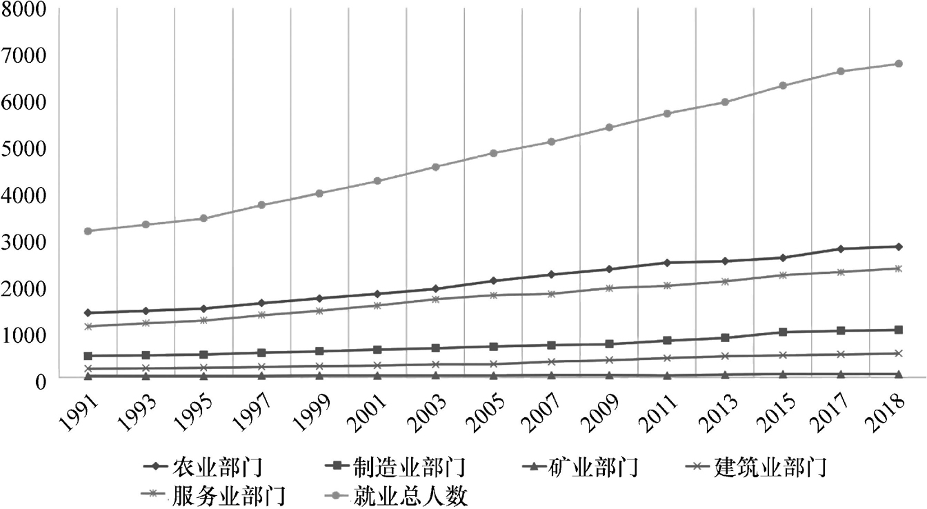 从1991—2018年就业数据来看,1991年总就业人数为3165.79万人,其中农业部门就业人口数为1394.72万人、制造业部门就业人口数为460.64万人、矿业部门就业人口数为25.97万人、建筑业部门就业人口数为184万人、服务业部门就业人口数为1100.47万人。