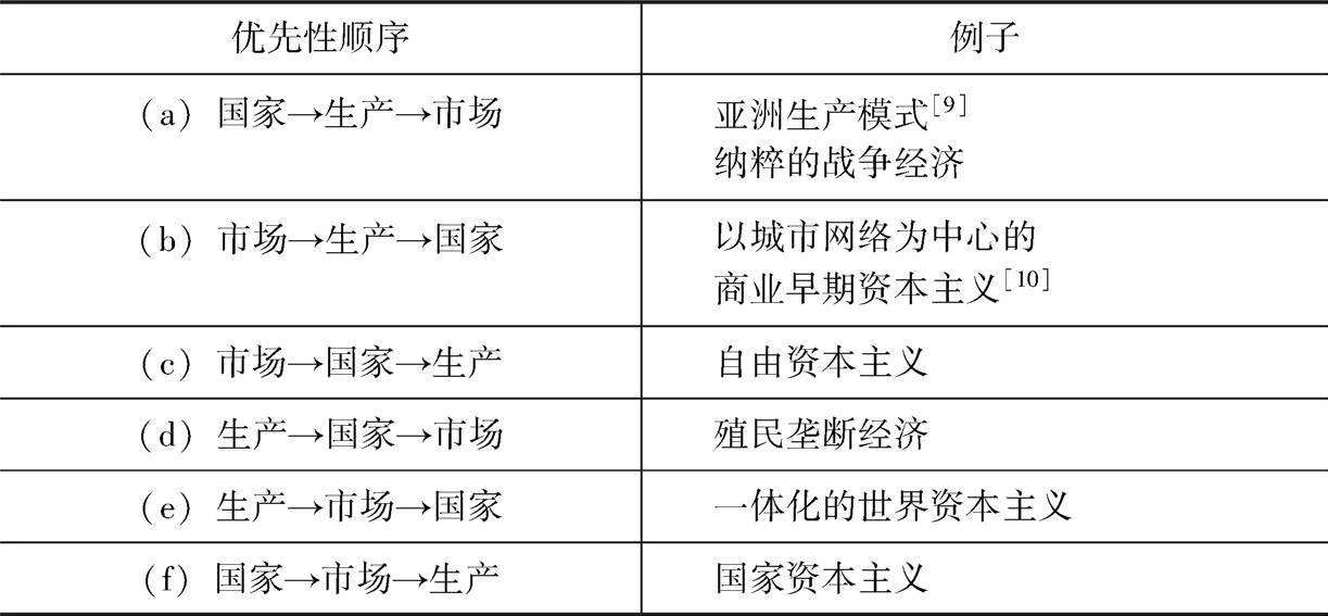 优先顺序(a)将市场调到了第三位,具体例子有亚洲生产模式或纳粹的战争经济(强迫性劳动,货币经济的控制相对较小,法老或元首掌控的国家无所不能的性质得到典型体现)。这造成特殊的历史难题。
