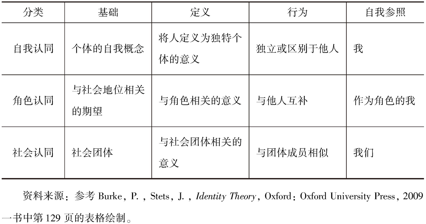 通过上述分析,之所以有自我认同、角色认同和社会认同的划分,实际上是研究者们对认同现象所包含的不同方面的强调。自我认同的基础是个体的自我概念,角色认同的基础是与社会地位相关的期望,社会认同的基础则是个体所属的团体。这就使得个体的自我参照点及其相应的行为表现出了明显不同:自我认同的参照点是“我”(Me),角色认同的参照点是“作为角色的我”(Me as Role),社会认同的参照点则是“我们”(We);自我认同所产生的行为是独立于他人的,角色认同所产生的是与他人互补的行为,社会认同则让个体表现出与团体内成员行为的一致性(详见表2-1)。