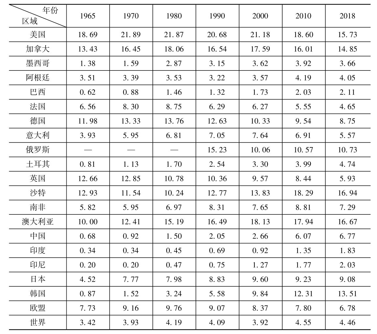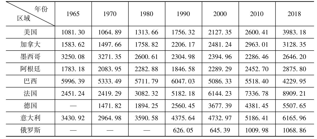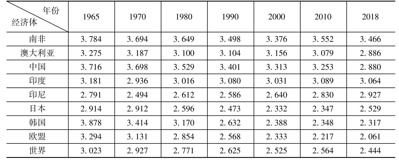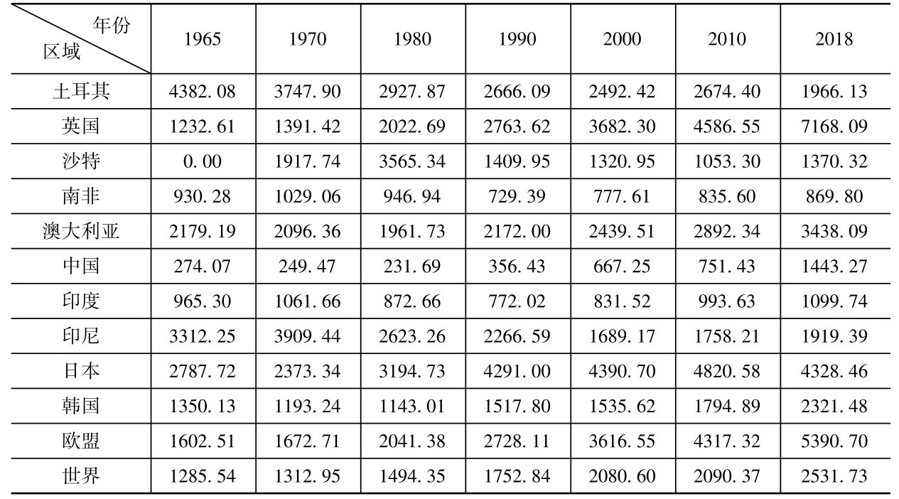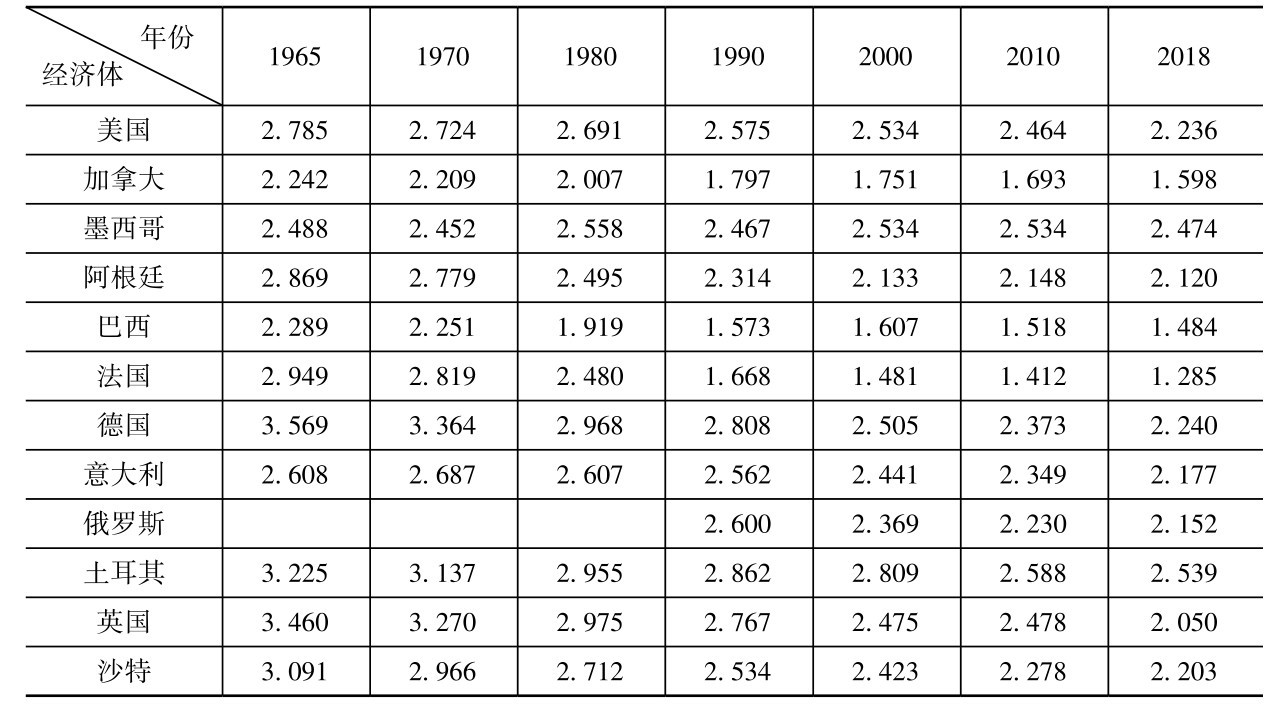 表2-1 世界主要经济体人均碳排放(吨CO 2 /人)(1965—2018年)