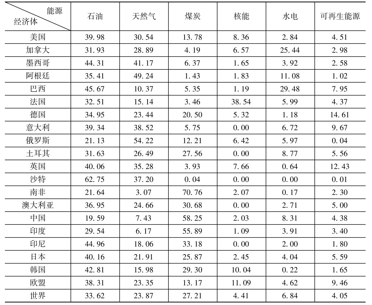 表2-5 世界主要经济体能源消费结构(2018年) (单位:%)