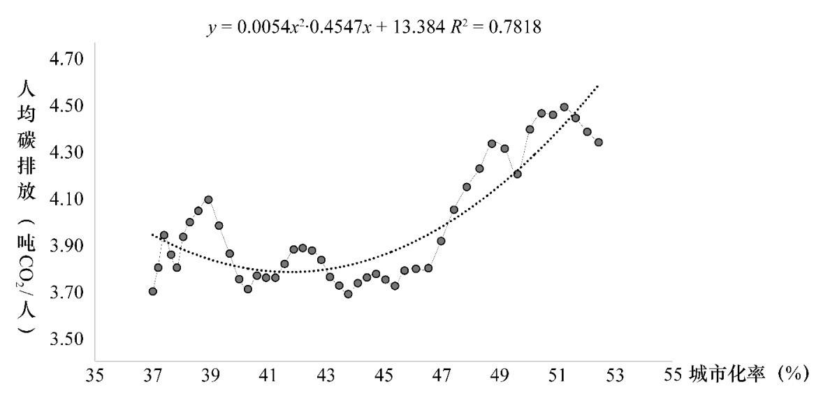 数据表明,人均碳排放和城市化水平存在密切的相关关系( R 2 =0.7818),1971—2016年,世界城市化率由36.75%增长到54.37%,同期世界人均碳排放介于3.71吨CO 2 /人和4.50吨CO 2 /人之间,尤其在2000—2013年期间,人均碳排放城市化水平和城市化水平存在更为密切的相关关系( R 2 =0.9442),2014年起世界人均碳排放呈现下降趋势,这充分说明世界各国开展应对气候变化工作取得了积极进展。