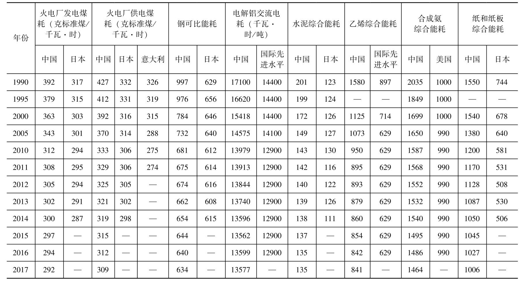 表2-3 主要高耗能产品单位能耗中外比较 单位:千克标准煤/吨