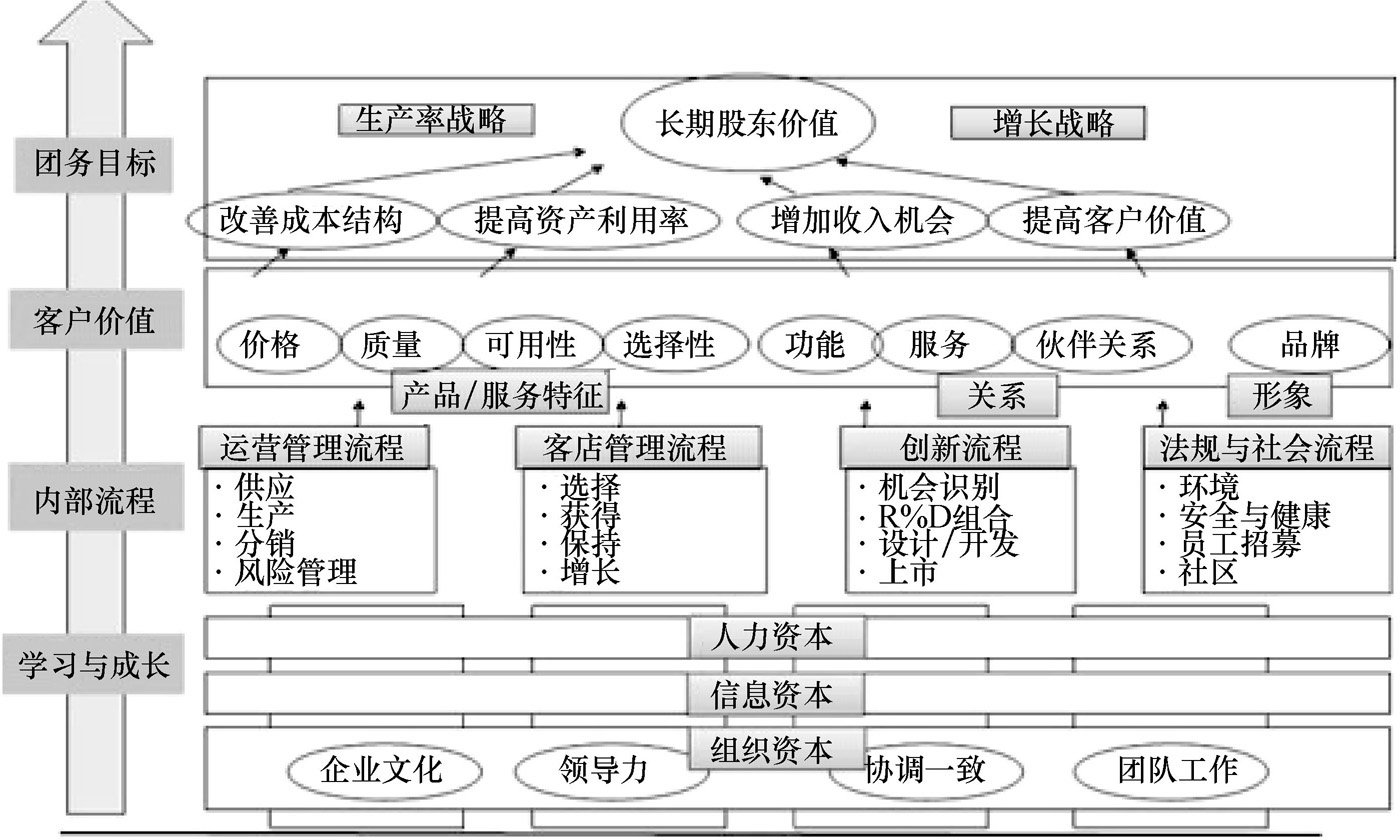 学习与成长层面:企业只有通过不断地学习以及不断地成长,才能实现不断进步,因此这个层面为其他三个层面提供了源源不断的动力。它是整个框架的基础,是其他三个层面实现其目标的根本保障。因此,企业要对其内部的学习与成长给予足够的关注。该层面主要包括员工能力、信息系统能力、激励、授权和协作等方面的内容。首先,人才是企业进步的关键因素,因此该层面的核心是员工能力;其次,信息系统能力是现代企业发展的保障和能够有效运行的必要支撑,要想充分发挥员工的能力,就要有完善的信息系统,使他们获得充分的信息;最后,还要给予员工充分的激励和保障机制,树立团队协作意识,提高其工作热情,树立责任意识,从而使其更好地为企业发展服务。
