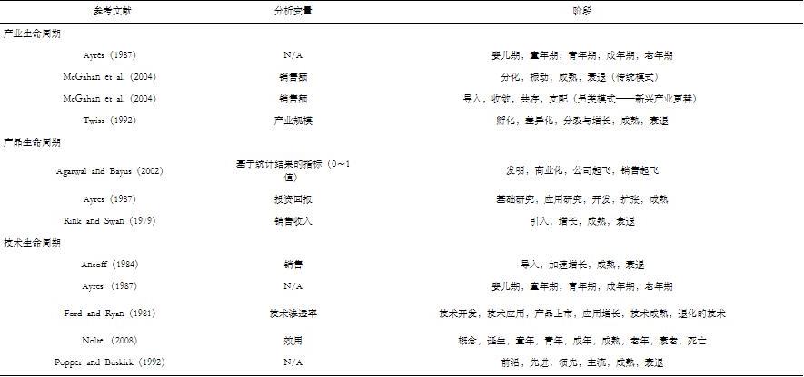 将技术产业看作生命有机体,其演化过程就可以隐喻为生命周期,用于对产业、产品和技术的发展研究。经济学家克莱珀早在1992年就曾指出,越来越多的证据支持产业生命周期理论。它对企业和产业的演化作出了很好的解释。这些文献探讨了两个核心观点,即谁在创新以及创新活动是如何发生的。根据克莱珀(Klepper,1996)的看法,这两个问题的答案均与产业生命周期中的阶段紧密相关。
