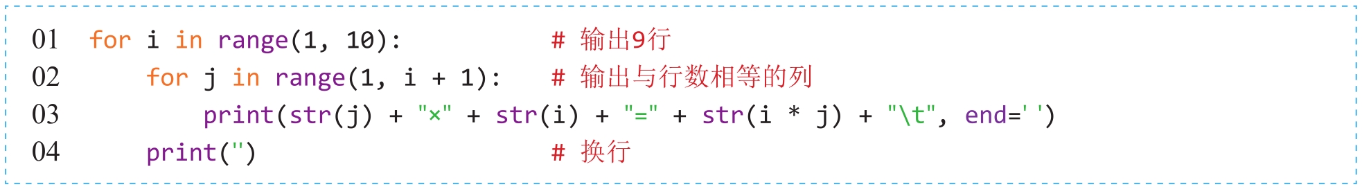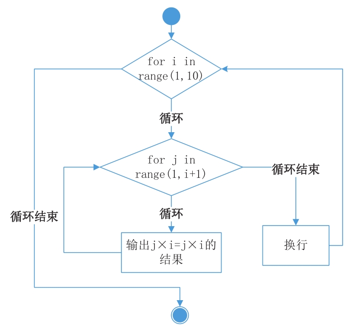 本实例的代码使用了双层for循环(循环流程如图3.22所示),第一个循环可以看成是对乘法表行数的控制,同时也是每一个乘法公式的第二个因数;第二个循环控制乘法表的列数,列数的最大值应该等于行数,因此第二个循环的条件应该是建立在第一个循环的基础上的。