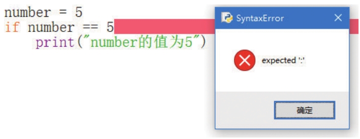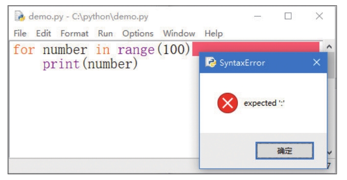 运行后,将产生如图3.19所示语法错误。解决的方法是在第一行代码的结尾处添加一个冒号。