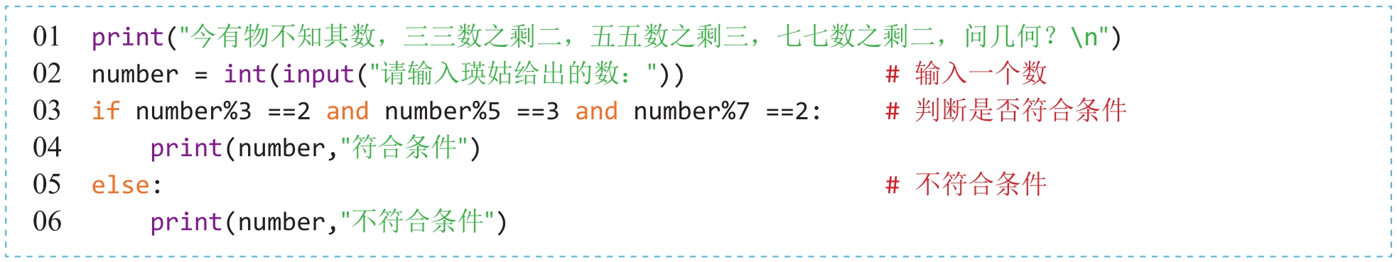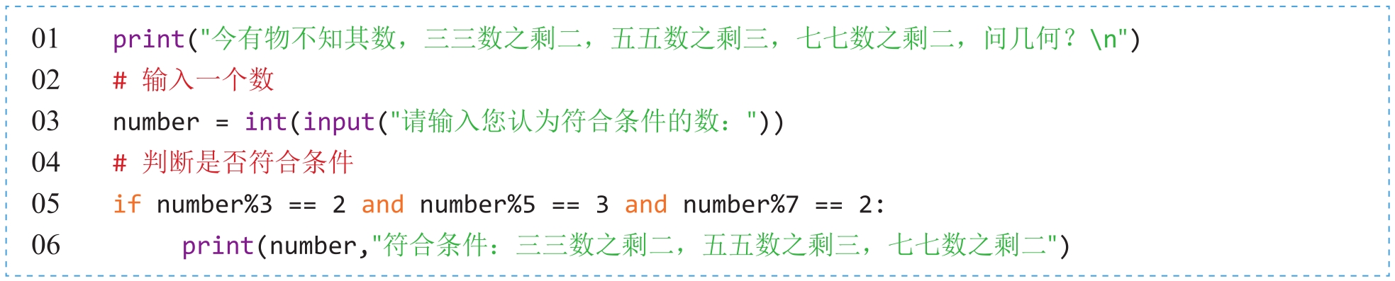 ☑ 需要满足的条件是一个数,除以三余二,除以五余三,除以七余二。这就涉及条件判断,需要通过选择语句实现。
