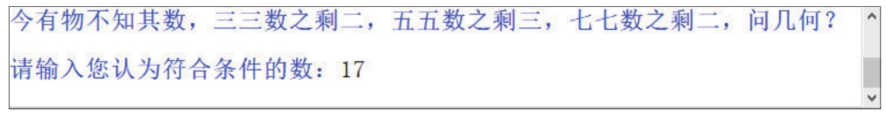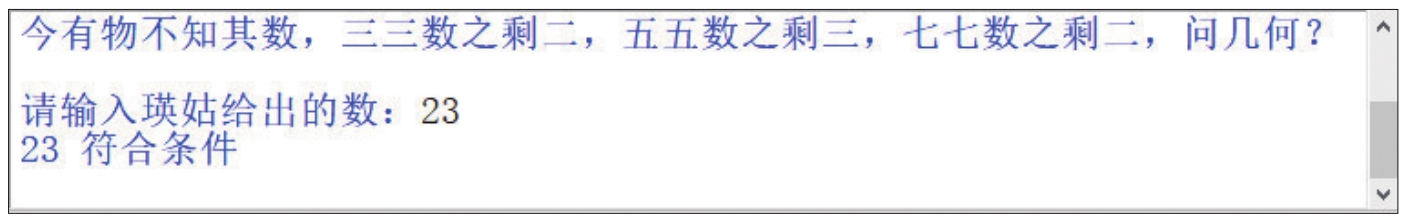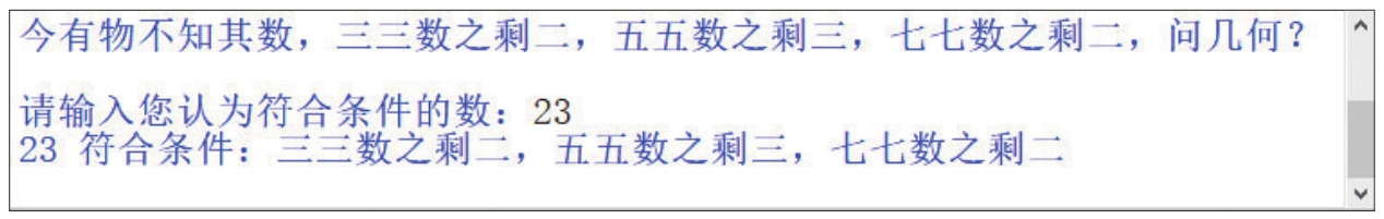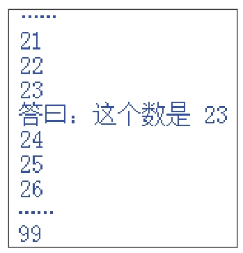 运行程序,将显示如图3.17所示效果。从图3.17中可以看出第一个符合条件的数是23,这就是黄蓉想要的答案。