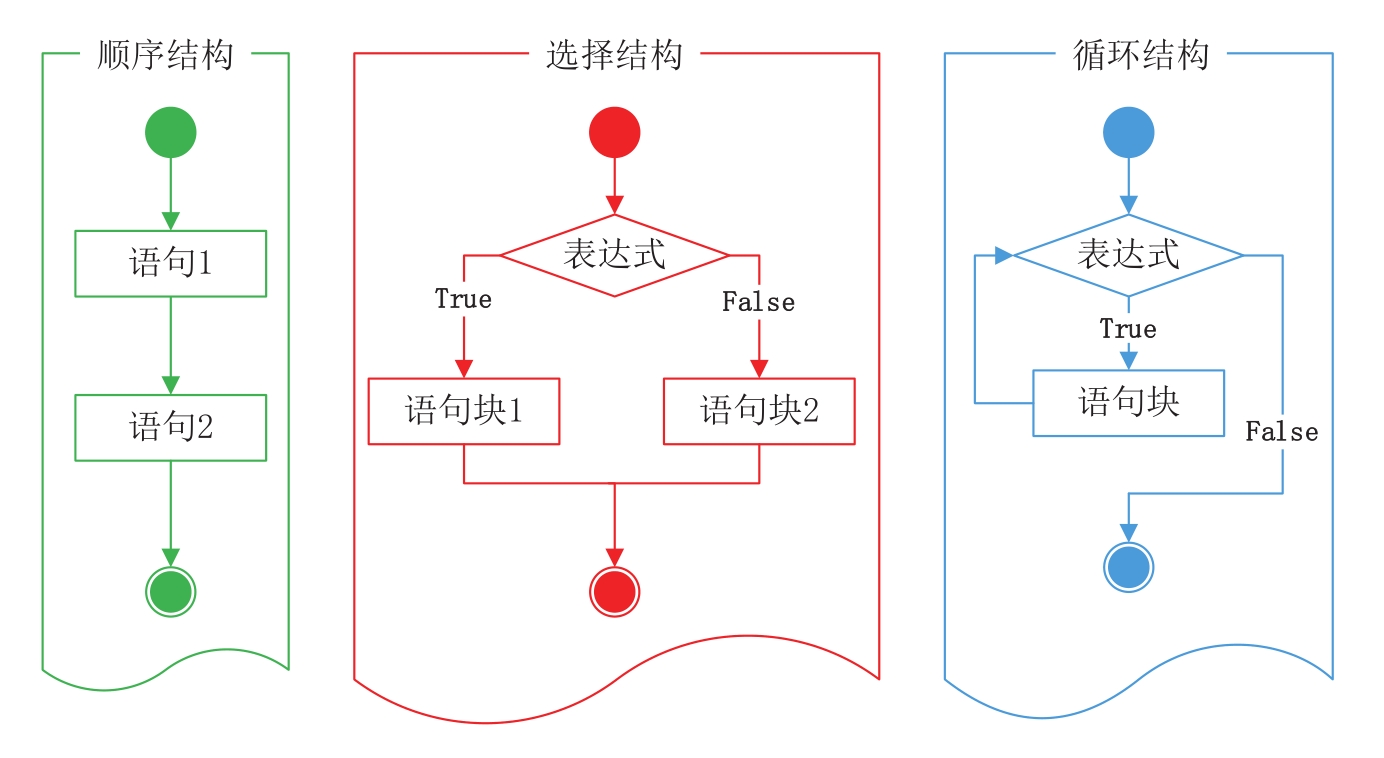 其中,第一幅图是顺序结构的流程图,编写完毕的语句按照编写顺序依次被执行;第二幅图是选择结构的流程图,它主要根据条件语句的结果选择执行不同的语句;第三幅图是循环结构的流程图,它是在一定条件下反复执行某段程序的流程结构,其中,被反复执行的语句称为循环体,决定循环是否终止的判断条件称为循环条件。
