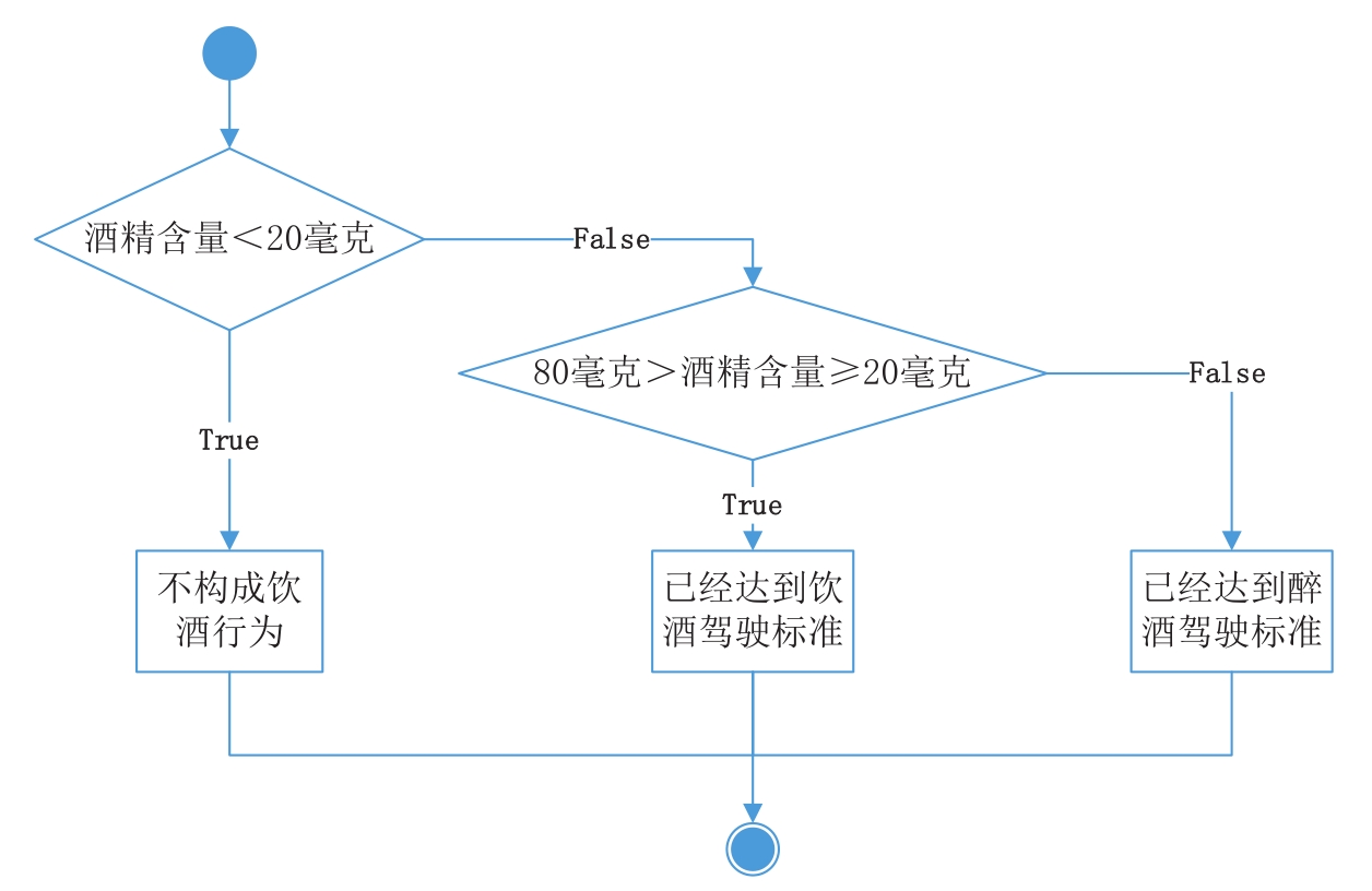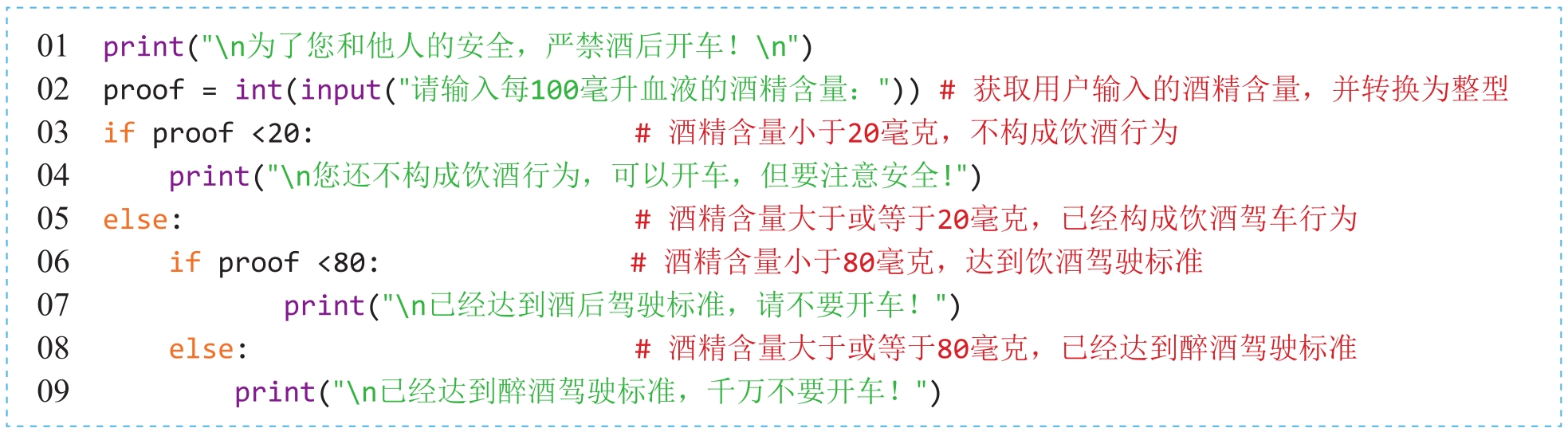 场景模拟 国家质量监督检验检疫局发布的《车辆驾驶人员血液、呼气酒精含量阈值与检验》中规定:车辆驾驶人员血液中的酒精含量小于20mg/100ml不构成饮酒驾驶行为;酒精含量大于或等于20mg/100m、小于80mg/100ml为饮酒驾车;酒精含量大于或等于80mg/100ml为醉酒驾车。现编写一段Python代码判断是否酒后驾车。