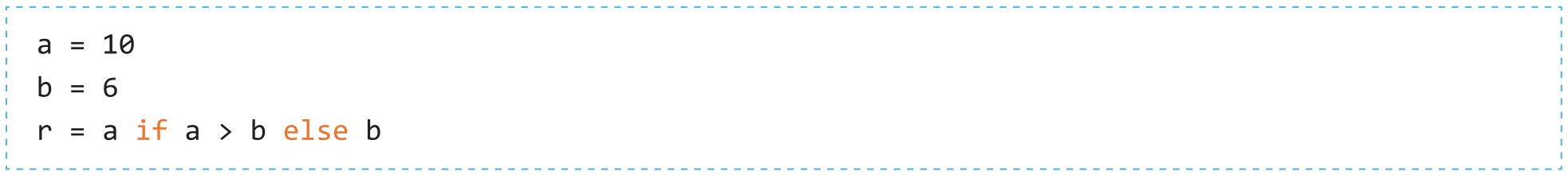 使用条件表达式时,先计算中间的条件(a>b),如果结果为True,返回if语句左边的值,否则返回else右边的值。例如上面表达式中r的值为10。