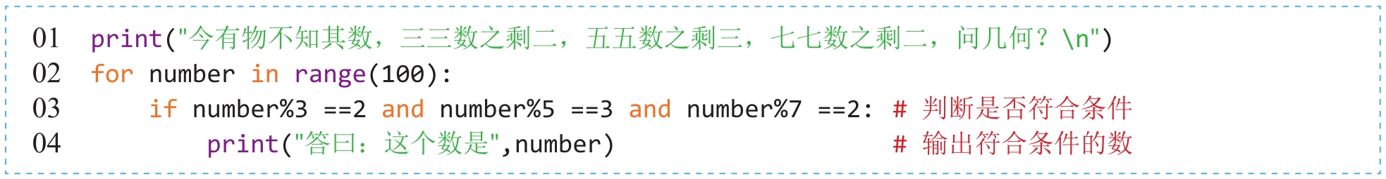 使用for循环语句实现从1循环到100(不包含100),并且记录符合黄蓉要求的数。具体的实现方法是:应用for循环语句从1迭代到99,在循环体中,判断迭代变量number是否符合“三三数之剩二,五五数之剩三,七七数之剩二”的要求,如果符合则应用print()函数输出,否则继续循环。具体代码如下: