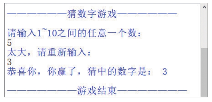 编写一个猜数字的小游戏,随机生成一个1到10之间(包括1和10)的数字作为基准数,玩家每次通过键盘输入一个数字,如果输入的数字和基准数相同,则成功过关,否则重新输入。如果玩家输入-1,则表示退出游戏。效果如图3.32所示。