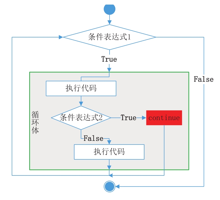 其中,条件表达式2用于判断何时调用continue语句跳出循环。在while语句中使用continue语句的流程如图3.28所示。