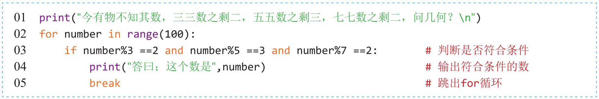 在实例06的最后一行代码下方再添加一个break语句,即可以实现找到符合要求的数后直接退出for循环。修改后的代码如下: