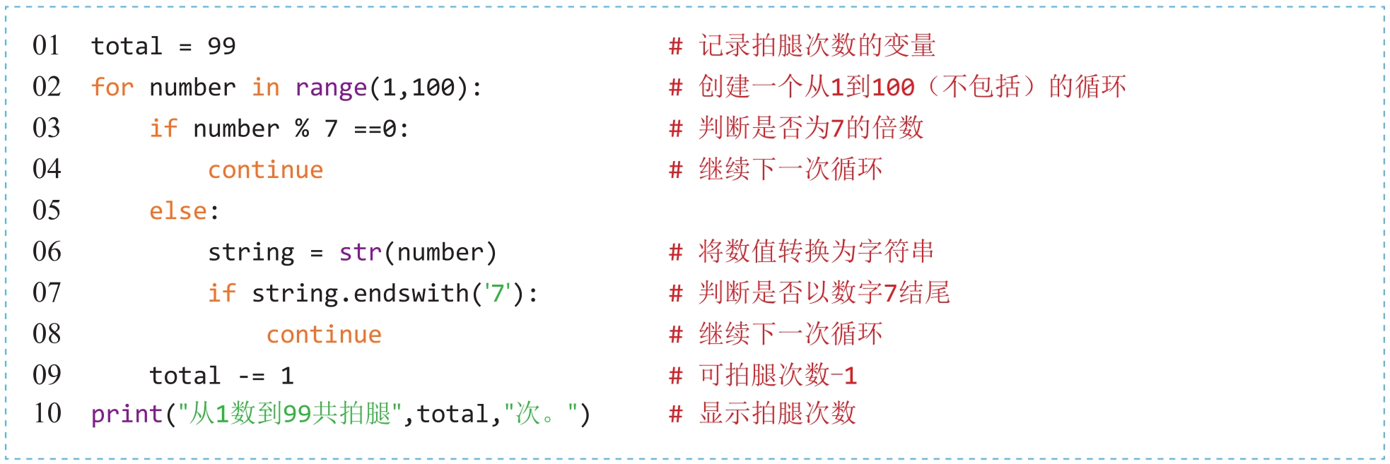第3行代码实现的是:当所判断的数字是7的倍数时,会执行第4行的continue语句,跳过后面的减1操作,直接进入下一次循环;同理,第7行代码用于判断是否以数字7结尾,如果是,直接进入下一次循环。