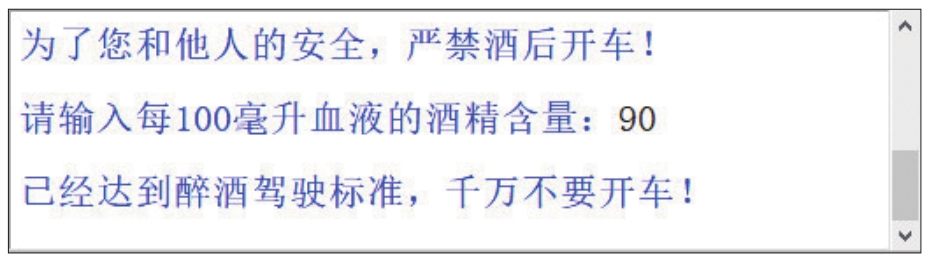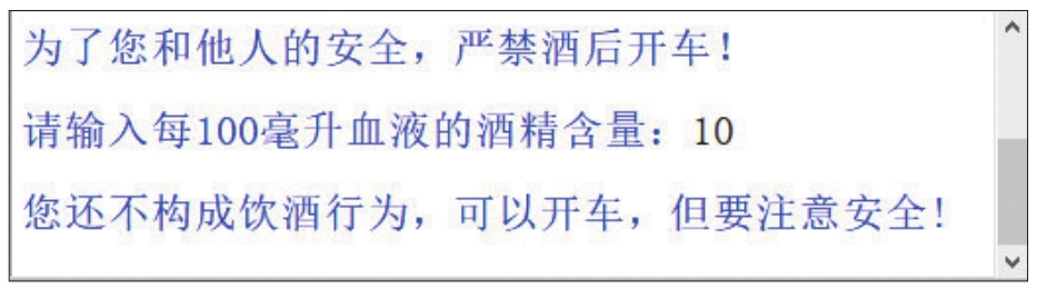 运行程序,当输入每100毫升酒精含量为10毫克时,将显示不构成饮酒行为,效果如图3.14所示;当输入酒精含量为90毫克时,将显示已经达到醉酒驾驶标准,效果如图3.15所示。
