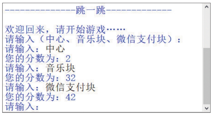 “跳一跳”小游戏中提供了一些加分块,当跳到这些加分块上时,会有额外的加分。本实战将模拟“跳一跳”小游戏,实现输入不同的加分块,显示应加的分数,效果如图3.33所示。