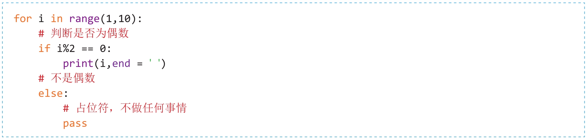 在Python中还有一个pass语句,表示空语句。它不做任何事情,一般起到占位作用。例如,在应用for循环输出1~10之间(不包括10)的偶数时,在不是偶数时,应用pass语句占个位置,方便以后对不是偶数的数进行处理。代码如下: