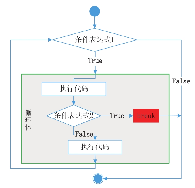 其中,条件表达式2用于判断何时调用break语句跳出循环。在while语句中使用break语句的流程如图3.24所示。