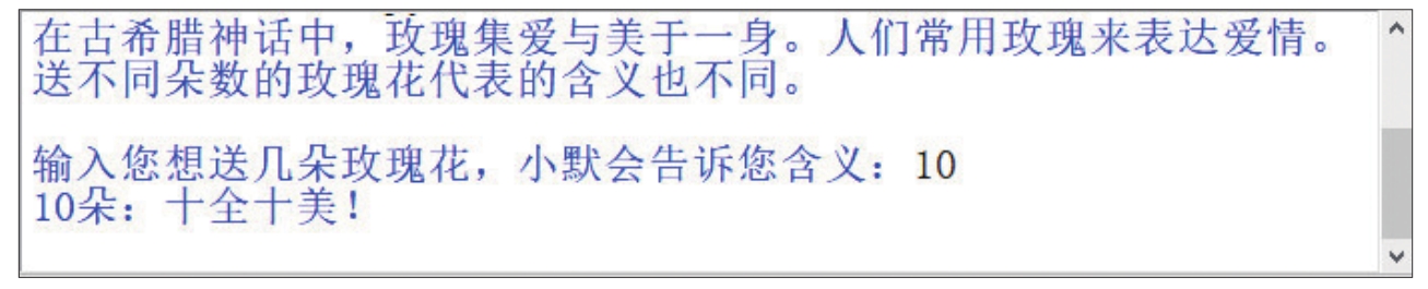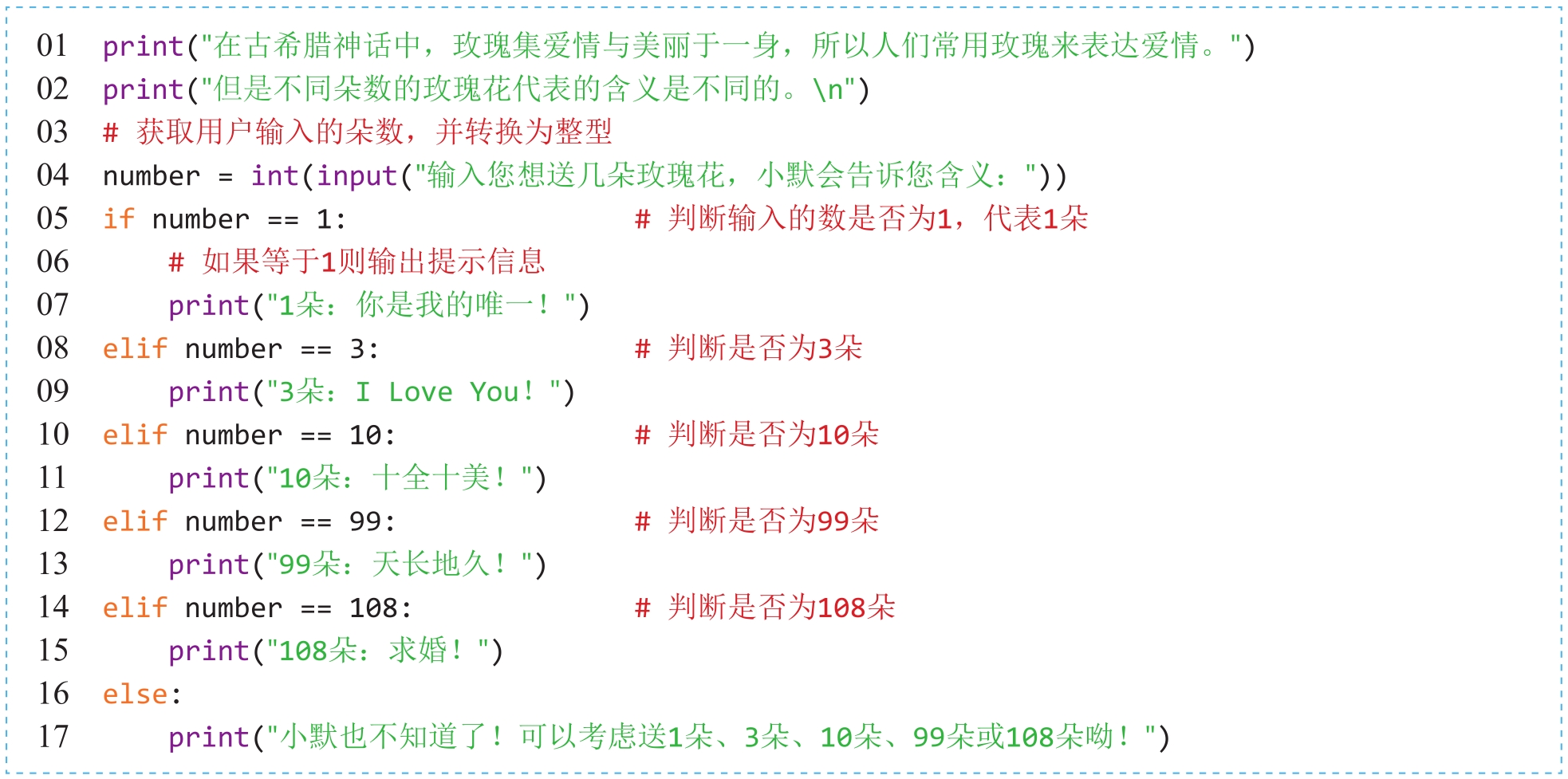 使用if…elif…else多分支语句实现根据用户输入的玫瑰花的朵数输出其代表的含义,代码如下: