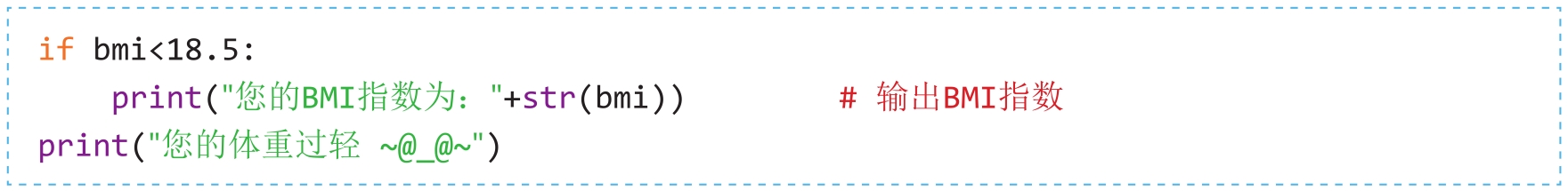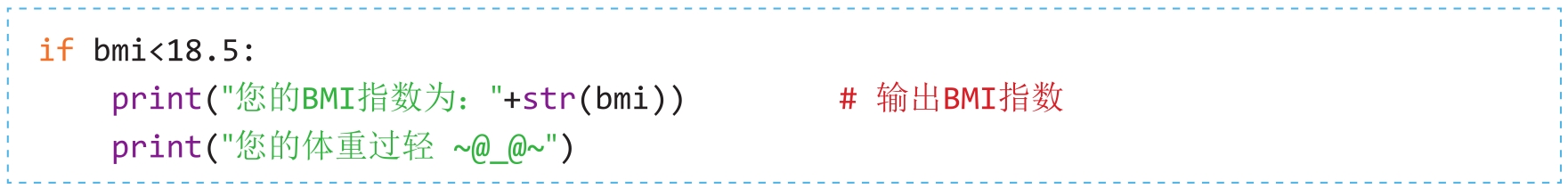 (2)使用if语句时,如果符合条件,则需要执行多个语句,例如,程序的真正意图是当bmi的值小于18.5时,才输出bmi的值和提示信息“您的体重过轻~@_@~”,那么正确的代码如下: