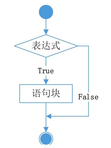 其中,表达式可以是一个单纯的布尔值或变量,也可以是比较表达式或逻辑表达式(例如:a>b and a!=c),如果表达式的值为真,则执行“语句块”;如果表达式的值为假,就跳过“语句块”,继续执行后面的语句,这种形式的if语句相当于汉语里的关联词语“如果……就……”,其流程图如图3.2所示。