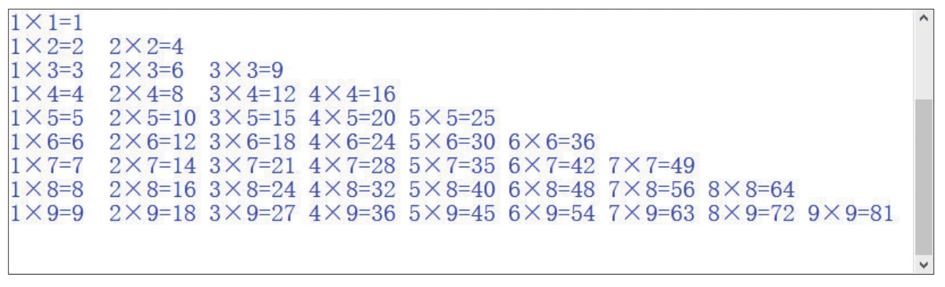 使用嵌套的for循环打印九九乘法表,代码如下: