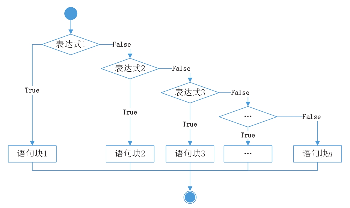 使用if…elif…else语句时,表达式可以是一个单纯的布尔值或变量,也可以是比较表达式或逻辑表达式,如果表达式的值为真,执行其下的语句;而如果表达式的值为假,则跳过该语句,进行下一个elif的判断,只有在所有表达式都为假的情况下,才会执行else中的语句。if…elif…else语句的流程如图3.11所示。