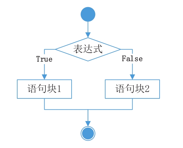 使用if…else语句时,表达式可以是一个单纯的布尔值或变量,也可以是比较表达式或逻辑表达式,如果满足条件,则执行if后面的语句块,否则,执行else后面的语句块,这种形式的选择语句相当于汉语里的关联词语“如果……否则……”,其流程图如图3.7所示。