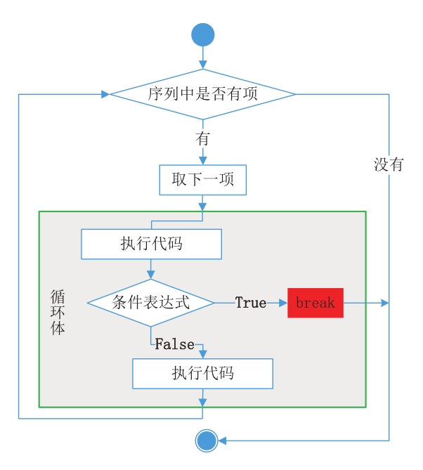 其中,条件表达式用于判断何时调用break语句跳出循环。在for语句中使用break语句的流程如图3.25所示。