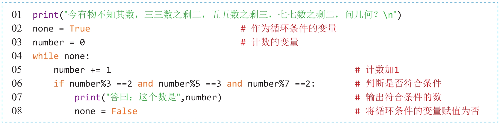 使用while循环语句实现从1开始依次尝试符合条件的数,直到找到符合条件的数时,才退出循环。具体的实现方法是:首先定义一个用于计数的变量number和一个作为循环条件的变量none(默认值为真),然后编写while循环语句,在循环体中,将变量number的值加1,并且判断number的值是否符合条件,当符合条件时,将变量none设置为假,从而退出循环。具体代码如下: