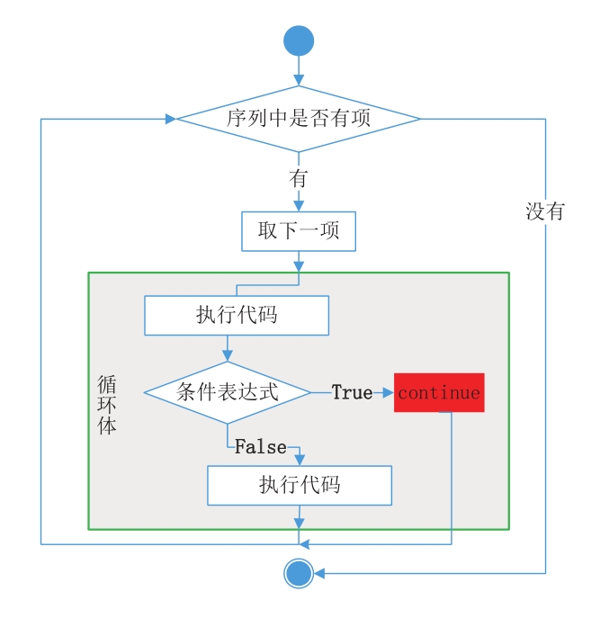 其中,条件表达式用于判断何时调用continue语句跳出循环。在for语句中使用continue语句的流程如图3.29所示。