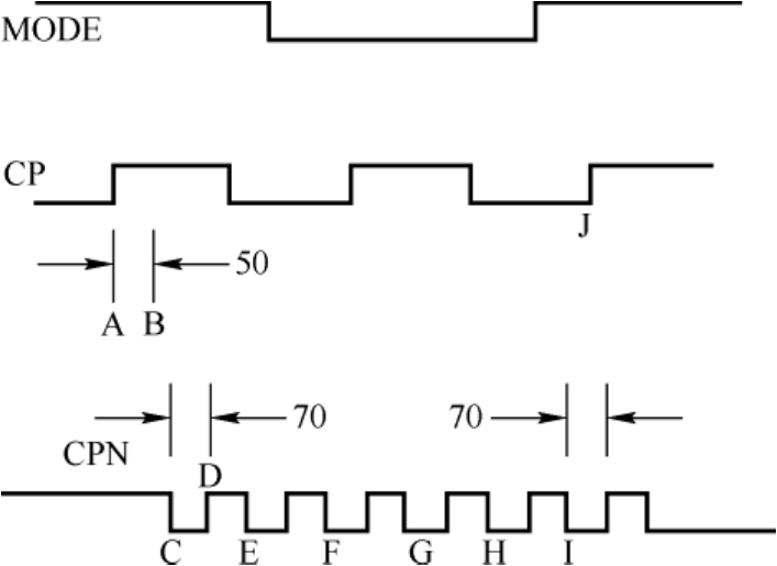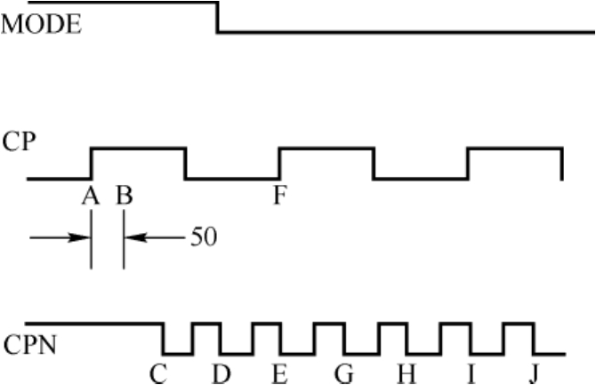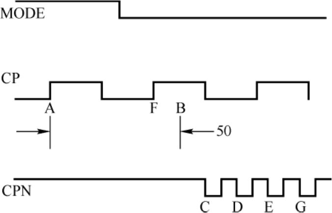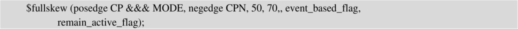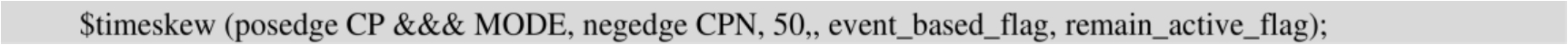 CP上第一个参考事件(A点标记)后,在CPN有一个负跳变(C点标记)时将产生一个时序冲突,将$timeskew检查改为静止的,且不会报告更多的冲突。当MODE为假时,在CP上产生第二个参考事件(F点标记),因此$timeskew检查保持静止。
