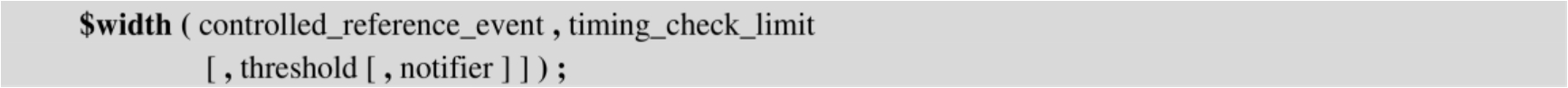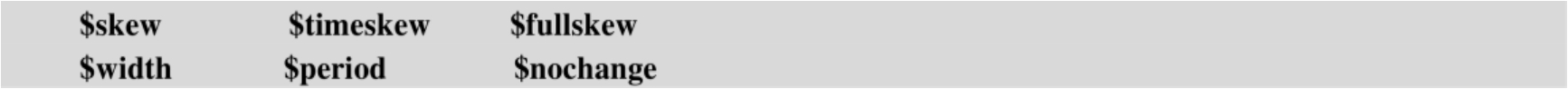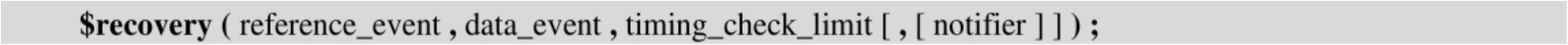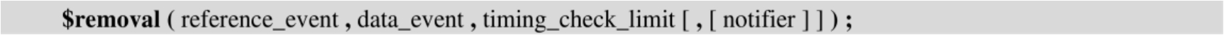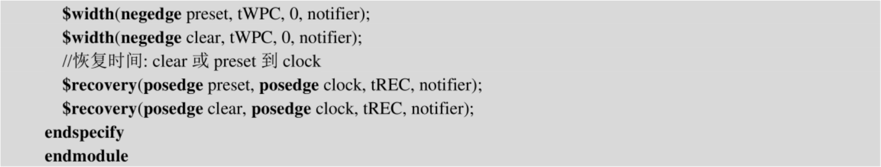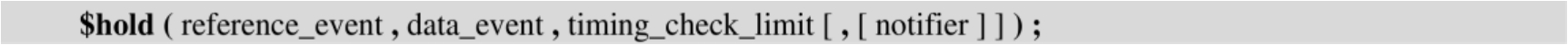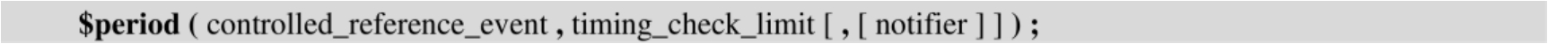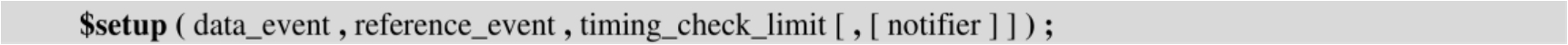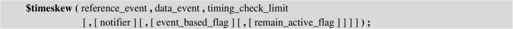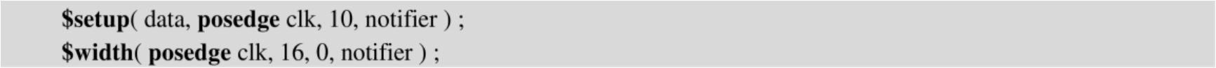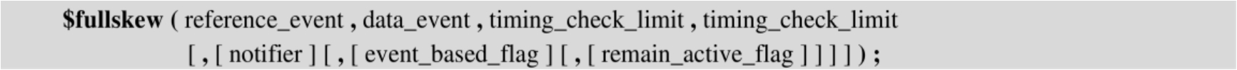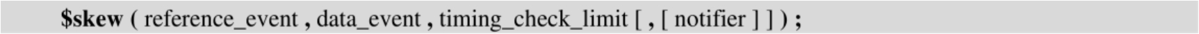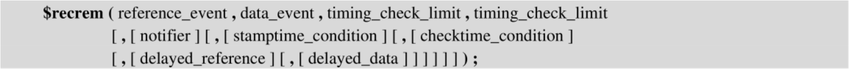 其中,隐含的data_event为时间戳边沿触发事件;reference_event为时间戳边沿触发事件;timing_ check_limit为非负常数表达式;notifier(可选)为Reg。