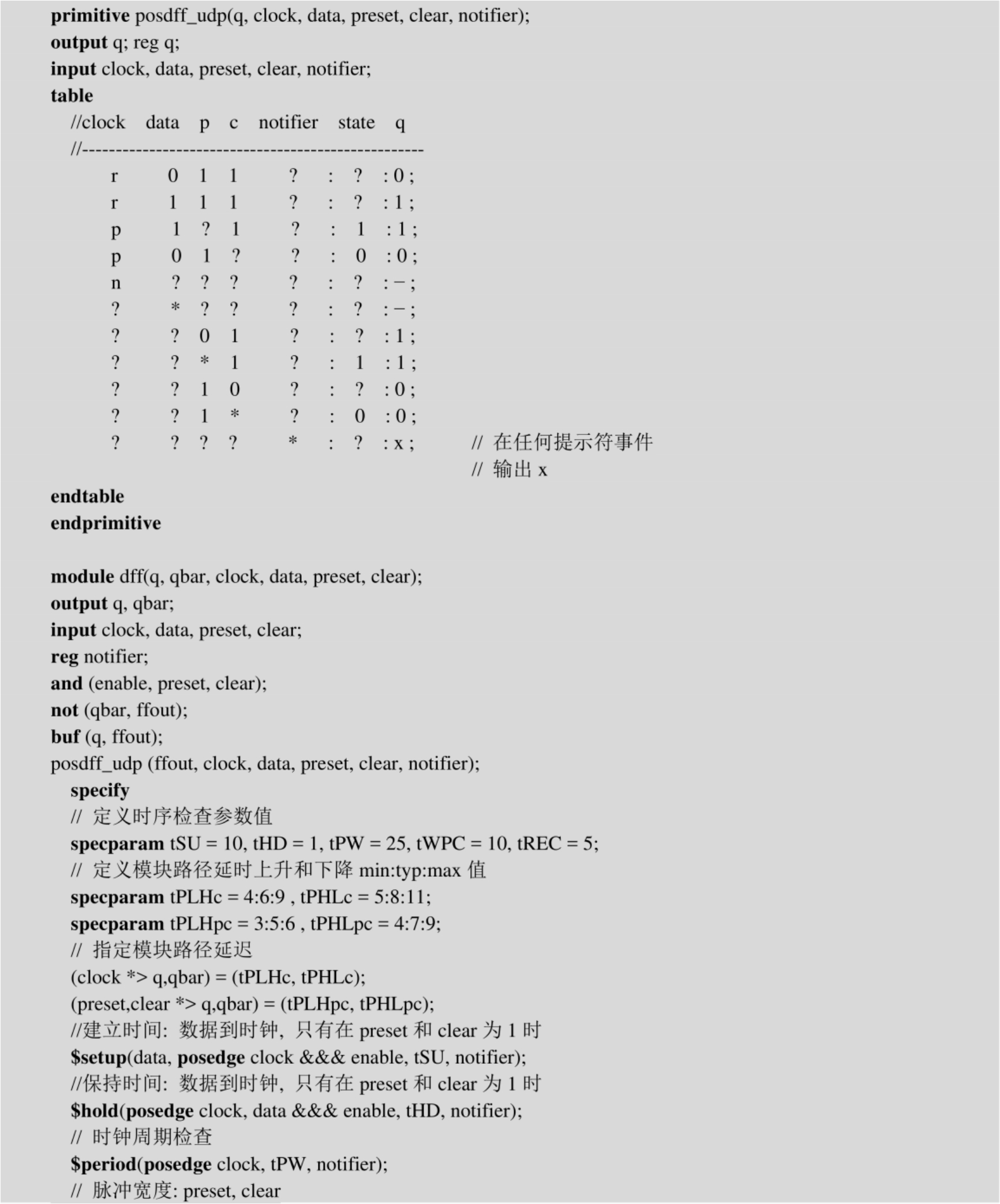 【例1.48】 向量信号时序检查Verilog HDL描述的例子,如代码清单1-22所示。