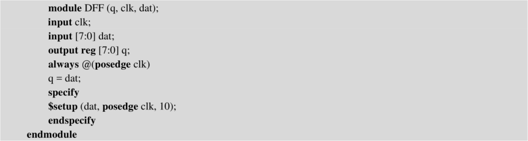 【例1.46】 无条件时序检查Verilog HDL描述的例子。