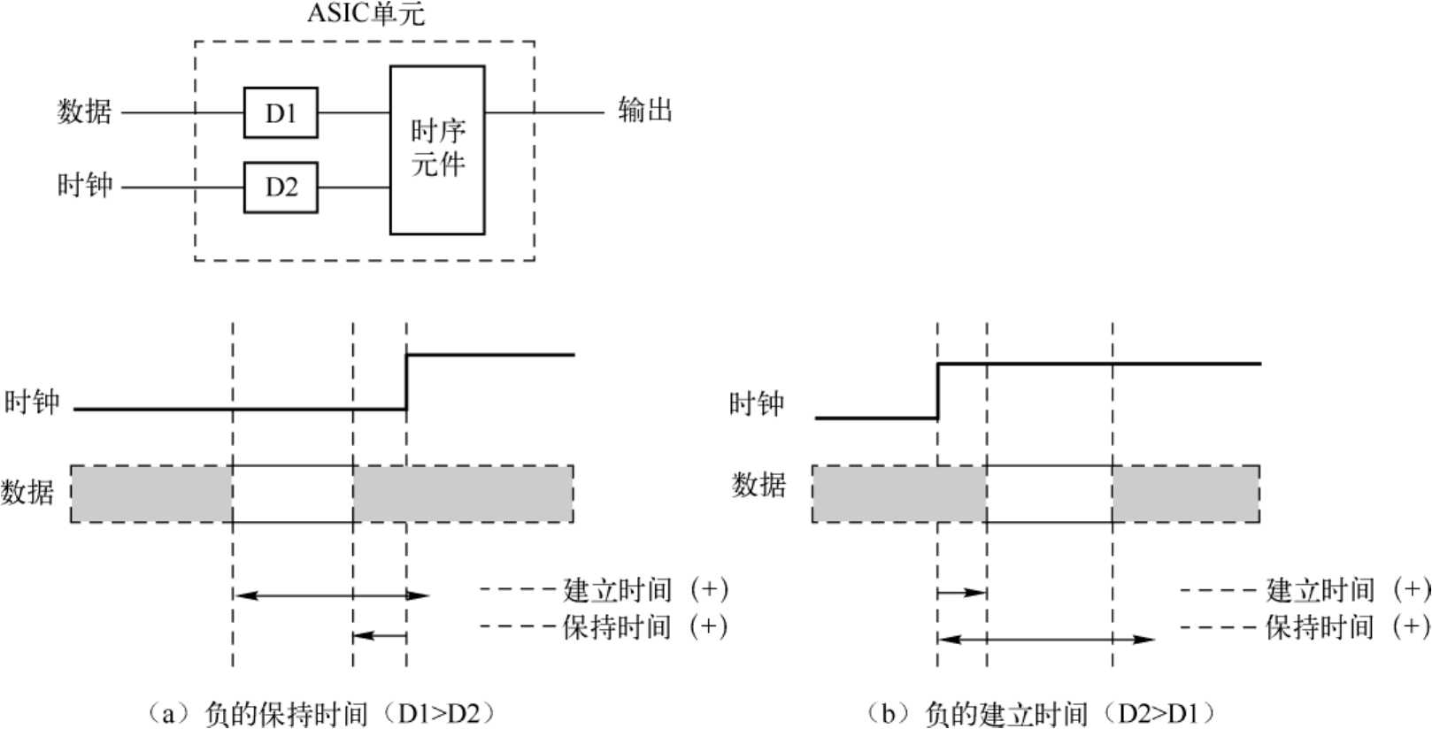 一个负的建立或保持时间,意味着冲突窗口移动到参考信号的前面或后面。在真实器件的内部,由于内部时钟和数据信号路径的不同,可能发生这种情况。从图1.21可知,这些延迟的显著差异会导致出现负的建立或保持值。