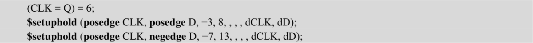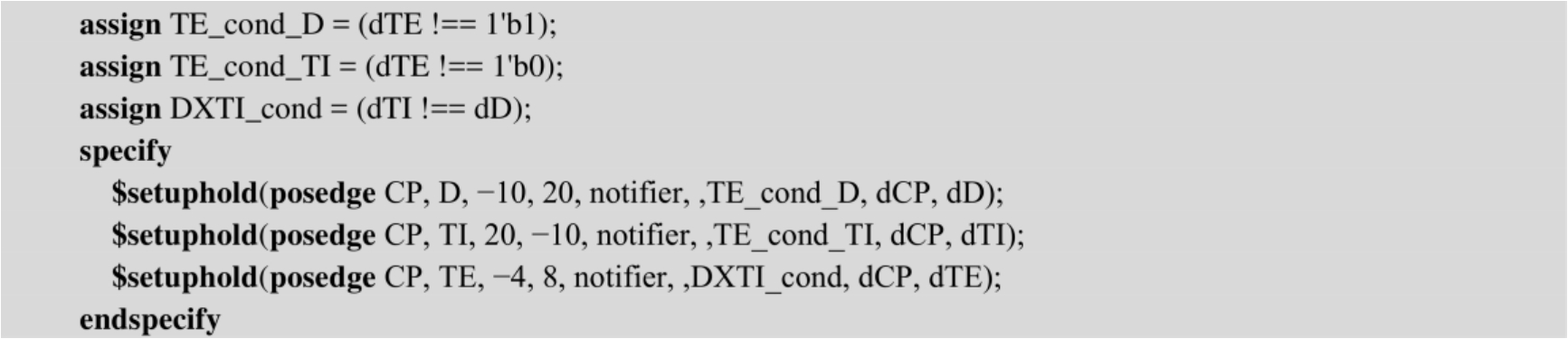 第一个$setuphold有负的建立时间。因此,时间检查条件TE_cond_D与数据信号D相关;第二个$setuphold有负的保持时间。因此,时间检查条件TE_cond_TI和参考信号CP相关;第三个$setuphold有负的建立时间。因此,时间检查条件DXTI_cond和数据信号TE相关。