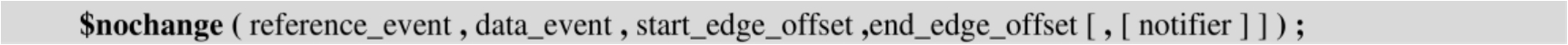 不像其他时序检查,$nochan ge 涉及三个跳变,而不是两个跳变。参考事件的前沿定义了时间窗口的开始,参考事件的后沿定义了时间窗口的结束。如果在时间窗口的任何时间内发生了数据事件,则导致冲突。