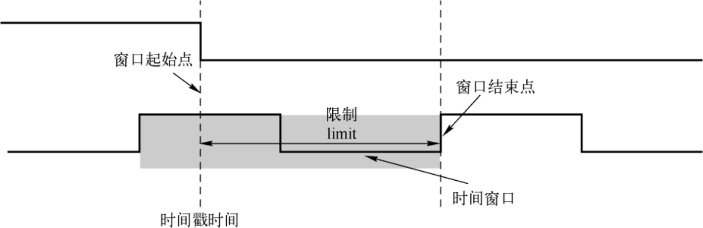 图1.12更清楚地说明以上公式给出的约束条件。从图中可知允许的建立时间窗口宽度由limit决定。对于数据信号(时间戳事件)来说,它应该在窗口的起点以外就应该有效。如果数据信号的有效时间落在了时间窗口内,就表示时间戳事件没有为参考事件(clk信号)提供足够的建立时间,也就是不满足建立时间要求,这就会产生建立时间的冲突。
